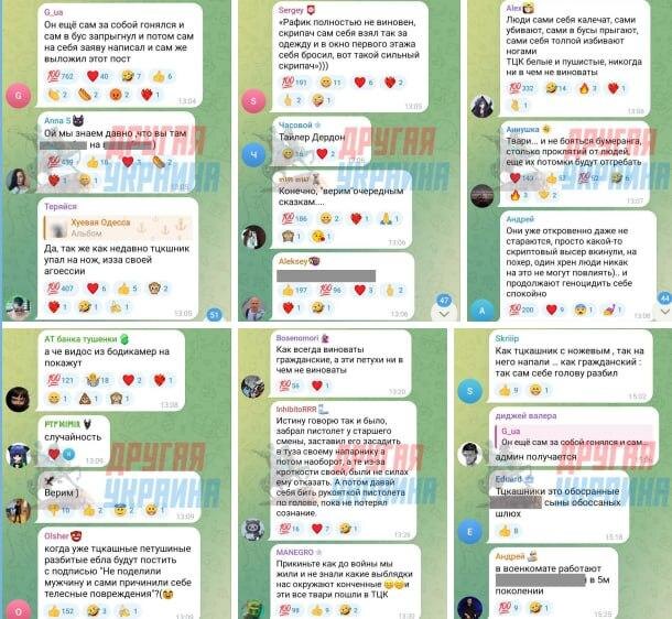 Пользователи жестко высмеяли заявления ТЦК, что парень, на которого они напали, «избил сам себя». Они написали в комментариях все, что думают про жестокость людоловов и их абсурдные оправдания. «Твари… и не боятся бумеранга, столько проклятий от людей, еще их потомки будут огребать», – написала одна из возмущенных одесситок. «Люди сами себя калечат, сами убивают, сами в бусы прыгают, сами себя толпой избивают ногами. ТЦК белые и пушистые, никогда ни в чем не виноваты» — с горькой иронией отметил другой комментатор. Украинцы признают, что, несмотря на тотальную ненависть к людоловам, те ничего не боятся и продолжают избивать и убивать тех, кто просто хочет жить.