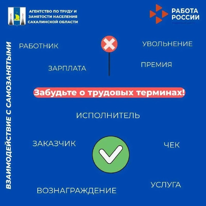 : ✨соблюсти правила и не перейти границу, за которой выгодное сотрудничество трансформируется в настоящие трудовые отношения. 💙Помните, оплата самозанятому должна зависеть от объема работ! 🖥Избегайте длительных периодичных выплат, как у штатных работников. На карточке приведены слова, которые сигнализируют о трудовых отношениях и не могут использоваться при работе с самозанятыми. 📍Работайте, соблюдая закон! ☎️А если остались вопросы по взаимодействию с самозанятыми – звоните по телефонам: 💛8 (4242) 672568 (агентство по труду и занятости населения Сахалинской области); 💛 8 (42435) 40586 (департамент экономического развития администрации Корсаковского муниципального округа).