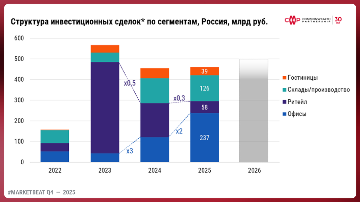 Согласно аналитическому отчету CMWP #MARKETBEAT, сумма инвестиций* в коммерческую недвижимость составила 461 млрд руб. за 2025 год, Согласно аналитическому отчету CMWP #MARKETBEAT, сумма инвестиций* в коммерческую недвижимость составила 461 млрд руб.** за 2025 год, незначительно превысив показатель прошлого года на 1% (455 млрд руб.). Второй год подряд наибольшая активность наблюдалась в офисном сегменте, демонстрирующий кратный рост по сравнению с 2023 г. Торговый сегмент, инвестиции в который поступали при реализации активов международного капитала, напротив, продолжает кратное сжатие с 2023 г. Несмотря на то, что около 22% объема инвестиционных сделок* были заключены в 4-м кв. 2025 г., крупнейшие приобретения по сегментам состоялись в 1–3 кв. В сумме сделки, представленные ниже, составляют более 45% инвестиционного объема за год. В трех сегментах из четырех самое крупное приобретение состоялось на торгах, либо непосредственно после них. Высокий уровень сделок, закрытых с торгов (д