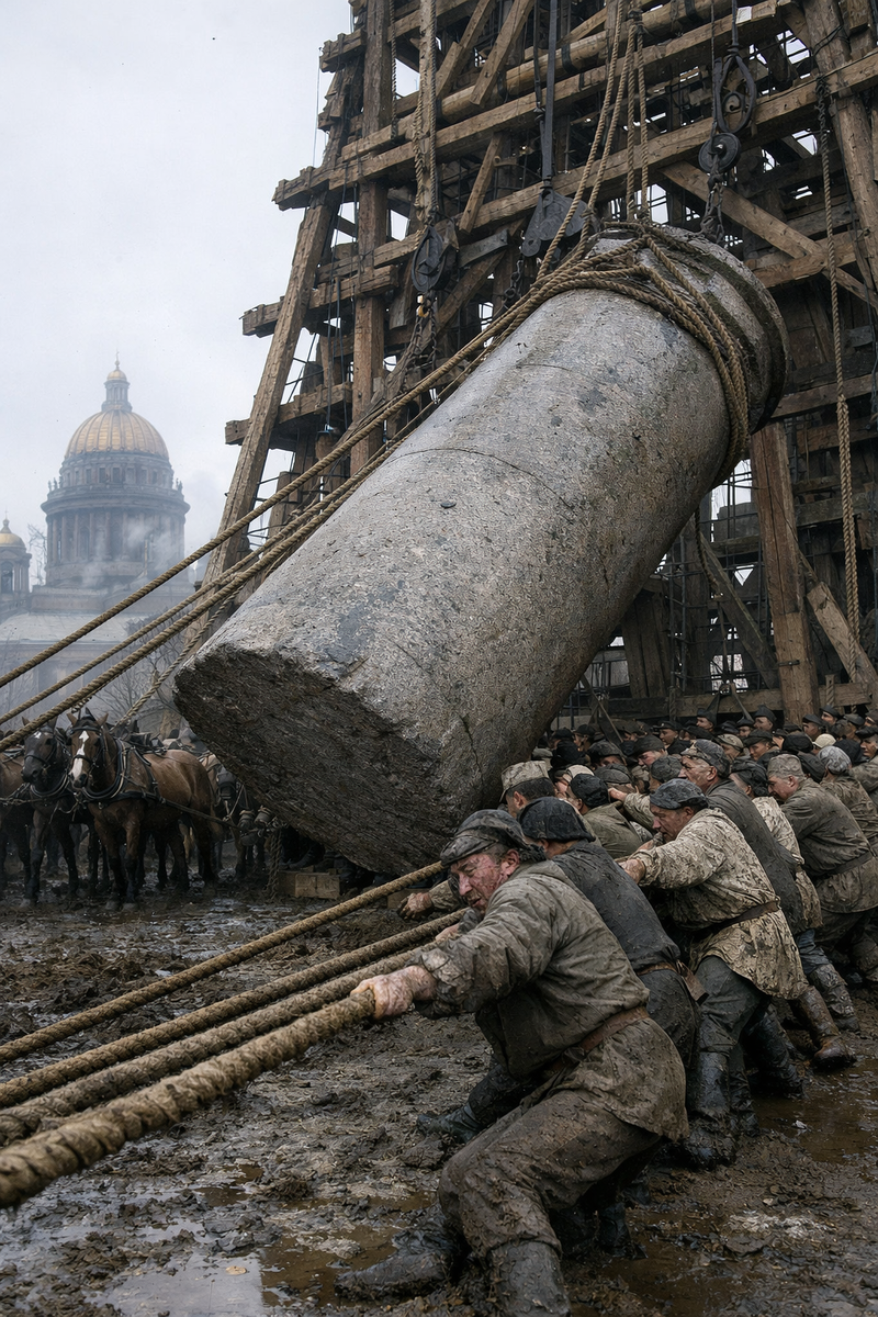 Подъём колонны занимал от трёх до шести дней. Использовались леса Бетанкура — система блоков и противовесов, где основная тяга создавалась конными воротами. Двести лошадей на один подъём, работали сменами. Колонну поднимали на высоту пятнадцать метров строго вертикально, с отклонением не более сантиметра — иначе вес начинал смещать центр тяжести, и монолит мог рухнуть.