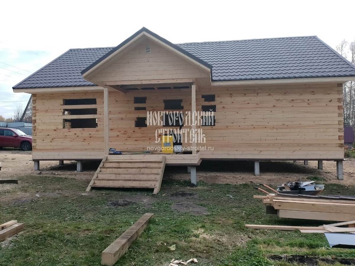 Сегодня мы хотим познакомить вас с еще одним реализованным проектом дома из сухого бруса. Его площадь 96м2 — это хороший вариант для небольшой семьи. Одноэтажный дом - хорошее решение для тех, кто не любит лестницы. Если размеры участка позволяют, совсем не обязательно строить дом в два этажа и ежедневно ходить вверх-вниз по лестнице. При достаточной площади застройки несложно расположить все необходимые помещения на одном уровне. Размеры дом - 8х12 м с двумя небольшими террасами - дают возможность устроить в нем сразу две спальни, большую кухню, гостиную, санузел, душевую с сауной и котельную. Кроме того, остается приличных размеров холл и тамбур. При желании перегородки внутри дома можно слегка сдвинуть, уменьшая размеры холла и увеличивая габариты комнат. Сруб из профилированного бруса возводим в технике "рубка в теплый угол", с утеплением джутовой лентой и дополнительным усилением стен нагелями. Фронтоны каркасные, с обшивкой имитацией бруса, без утепления. Чердачное пространство