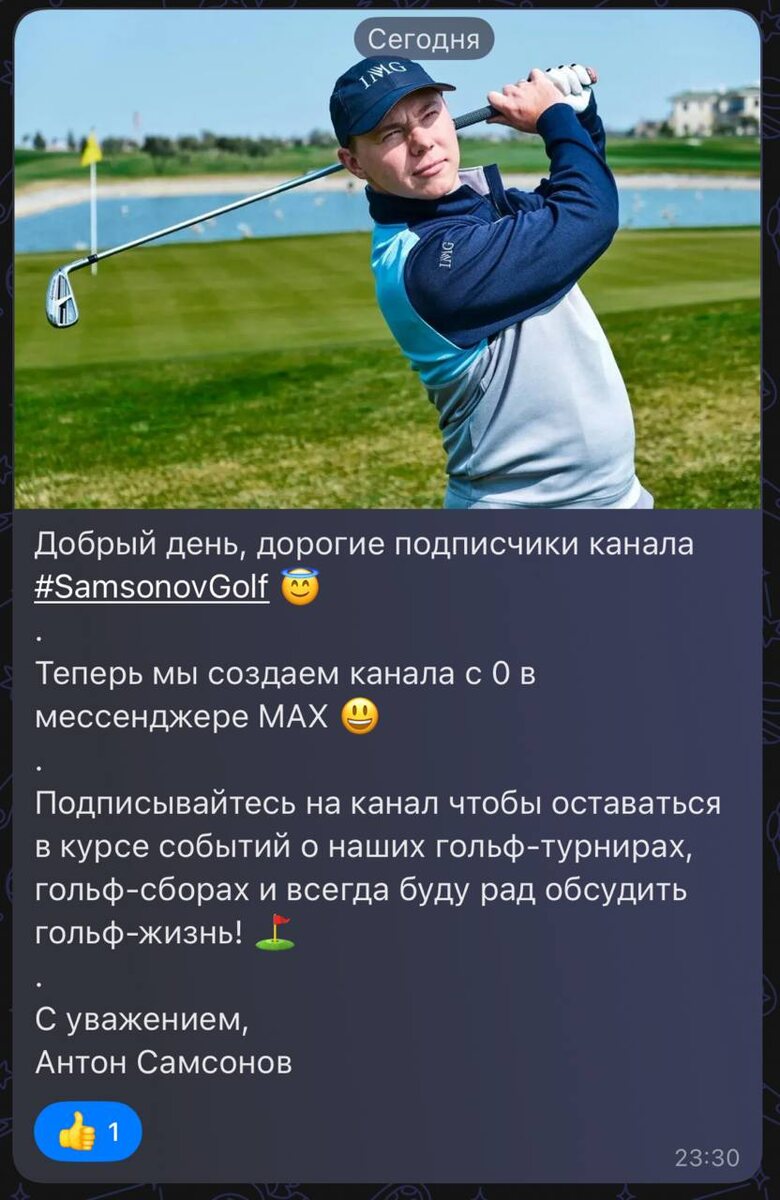 ! 💤 . Даже не верится, что за пару дней так сильно остановили связь и еще заблокировали столько VPN сервисов… . Сегодня был создан канал в MAX и если вы уже тоже там, то подписывайтесь по ссылке ниже ⬇️ . КАНАЛ SAMSONOVGOLF MAX . Что делать? Адаптироваться 😺 . Если я не отвечаю в ВатсАп, Телеграмм, то пишите в Макс 🤠 . Или… ищем друг друга в реальности 😹 . . #SamsonovGolf #ГольфУрокиРФ