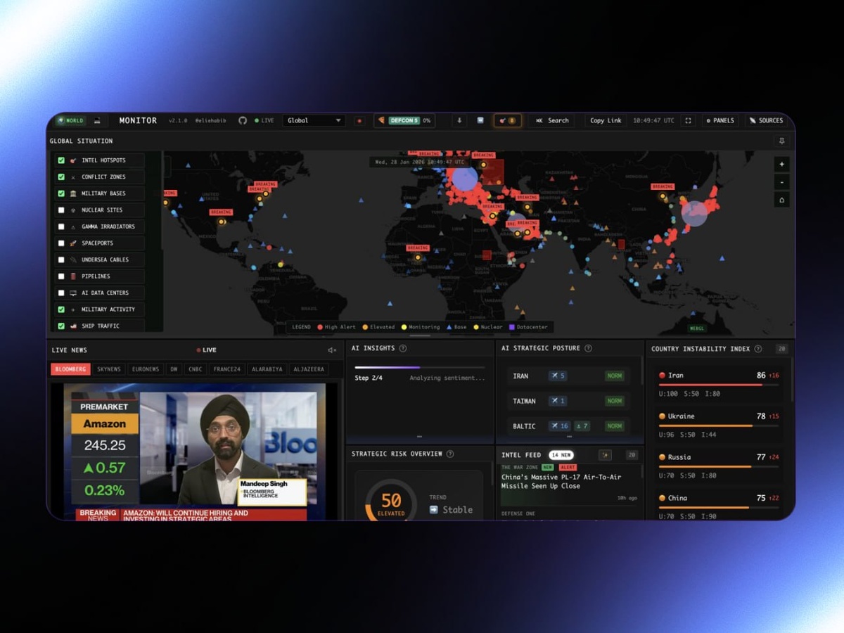 World Monitor — бесплатный дашборд, объединяющий новости, видео и события со всего мира в едином интерфейсе. На интерактивной карте отображается более 25 слоёв данных: • конфликты • протесты • аварии • перемещения техники • другие актуальные события Система использует искусственный интеллект для создания сводок в реальном времени, выявляя нестабильные регионы и аномалии до появления информации в медиа. Интеграция с видеоисточниками Bloomberg, Sky News, Al Jazeera, CNBC и спутниковыми данными позволяет мгновенно анализировать и визуализировать события на карте. https://dzen.ru/id/5c0e38ff46ef5c00aaa80527