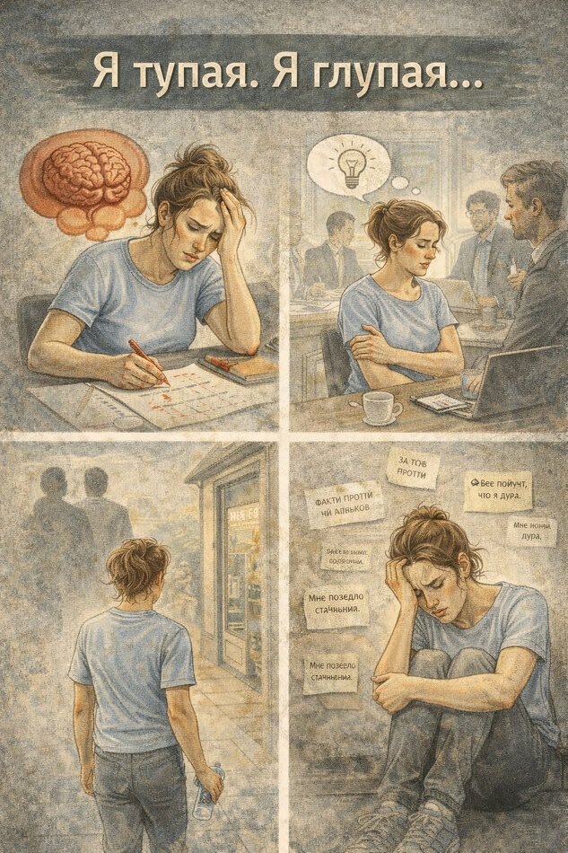 Статьи / Неврозы и эмоциональные расстройства Привет, глубокий человек 🌿 Это убеждение редко звучит просто как мысль. Обычно оно живёт фоном и проявляется так: И самое неприятное - ты можешь быть умной, компетентной, адекватной. Но убеждение не про факты. Оно про боль. Чаще всего это не “истина”, а опыт. Иногда даже без явного буллинга человек вырастает с установкой: “Чтобы меня любили, я должен быть идеальным. А если ошибусь - я ничтожество”. ГУ “я глупая” - это не только про самооценку. Это про поведение. И получается парадокс: ты можешь быть умной, но жить как будто “я недостаточно умна”. Факт - это “я ошиблась в отчёте”.