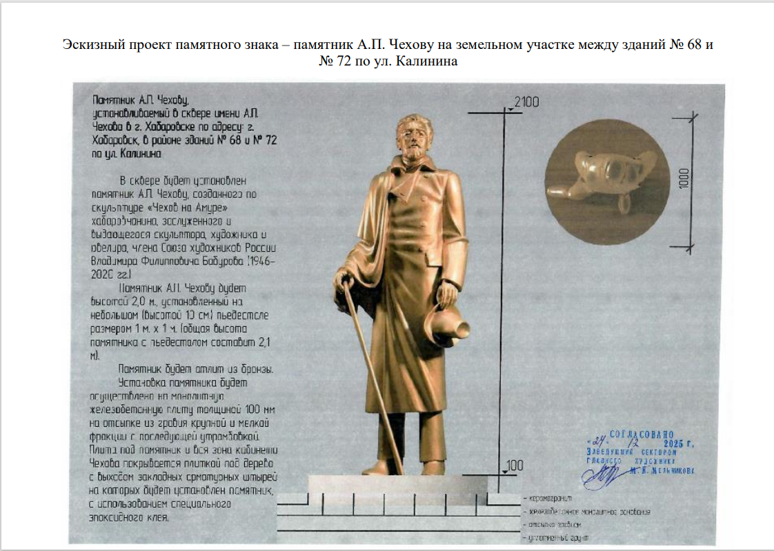 На днях на очередном заседании Хабаровская городская дума приняла решение установить памятный знак писателю Антону Павловичу Чехову. Ранее проект поддержали региональное отделение ВОРДИ, Хабаровская краевая организация профсоюза работников жизнеобеспечения, ХРБОО «Потому что могу» и многие другие общественные организации. Памятник появится в будущем сквере между зданиями № 68 и № 72 на улице Калинина. Согласно утвержденному эскизу, в сквере будет установлен бронзовый памятник по скульптуре «Чехов на Амуре» выдающегося хабаровского художника и ювелира Владимира Бабурова. Высота составит два метра, он будет размещен на небольшом пьедестале. Идея создания памятника и сквера имени Антона Павловича Чехова обсуждалась общественностью Хабаровска неоднократно — начиная с 2014 года. Инициатором проекта как раз и выступал хабаровский скульптор, член Союза художников России В. Ф. Бабуров. Он создал скульптуру «Чехов на Амуре» и безвозмездно передал ее в дар библиотеке. Однако реализовать замысел