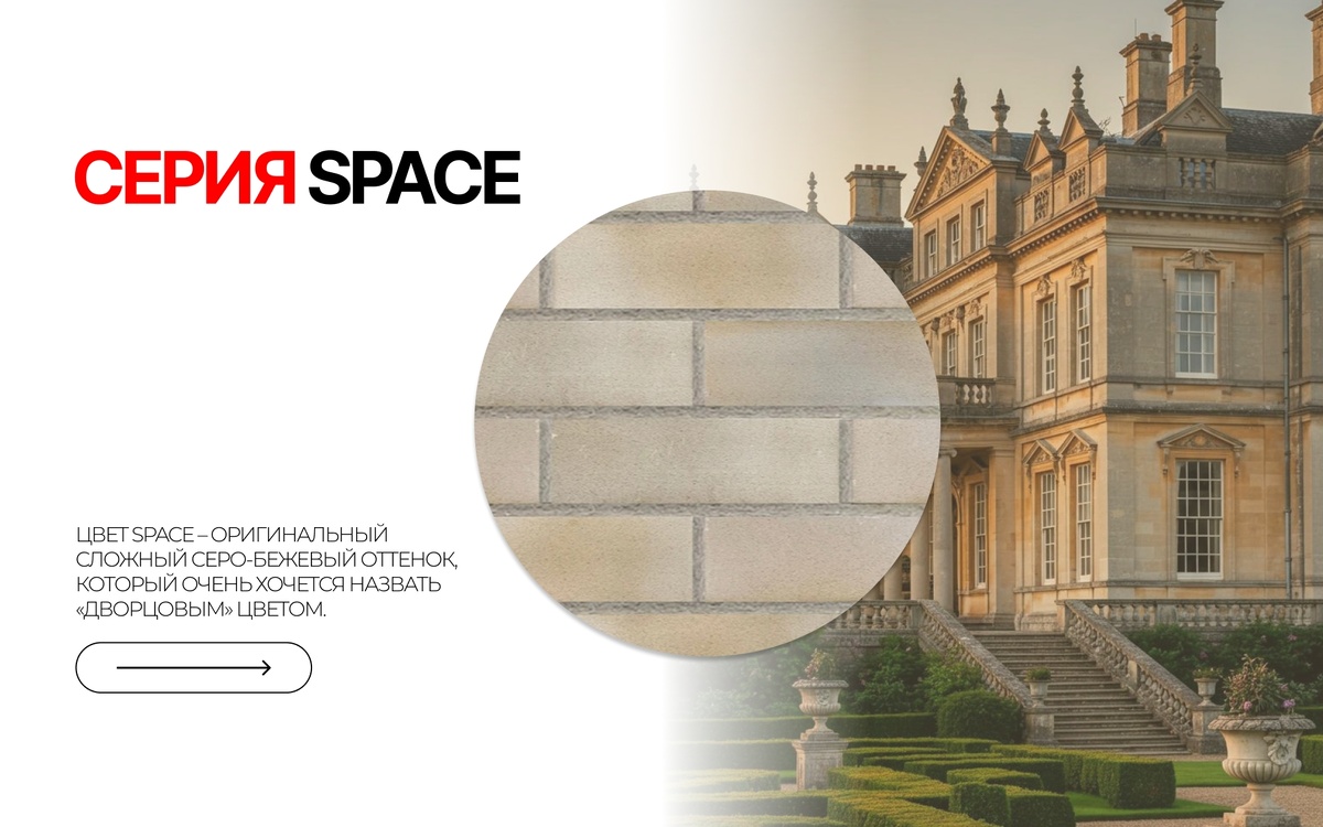 Мы не просто создали цвет, мы смоделировали рельеф. Коллекция SPACE — это результат сложного технологического диалога с материалом. Оттенок, полученный путем нанесения жгущейся минеральной пудры на серо-бежевый клинкерный черепок плитки с последующим высокотемпературным обжигом. Напыление пудры по замыслу дизайнера коллекции происходит аритмично, что рождает каждую плитку уникальной. Здесь нет места повторению. Каждая плитка - это отдельный артефакт, «снимок» хаотичной и величественной текстуры. Это не принт, а сама материя, изменённая на молекулярном уровне. Для фасада: Фасад, облицованный SPACE, перестаёт быть просто стеной, он становится объектом изучения, динамичной скульптурой. Игра света и тени на его рельефной поверхности создаёт постоянно меняющееся изображение в течение дня. Это смелый шаг для тех, чей дом манифест, а не тиражирование типичных решений. Для интерьера: SPACE мощнейший акцент, который переопределяет пространство. Он создаёт фокусную точку в минималистичной гостин