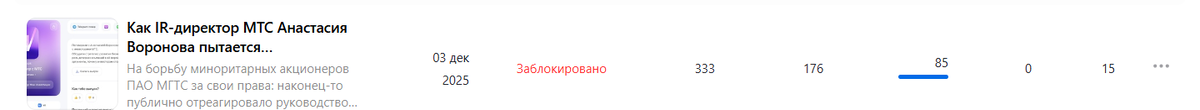 Кстати, эта борьба мозолит глаза некоторым горе-управленцам. Мою статью с разоблачением IR-директора Анастасии Вороновой из МТС заблокировали на Дзене: