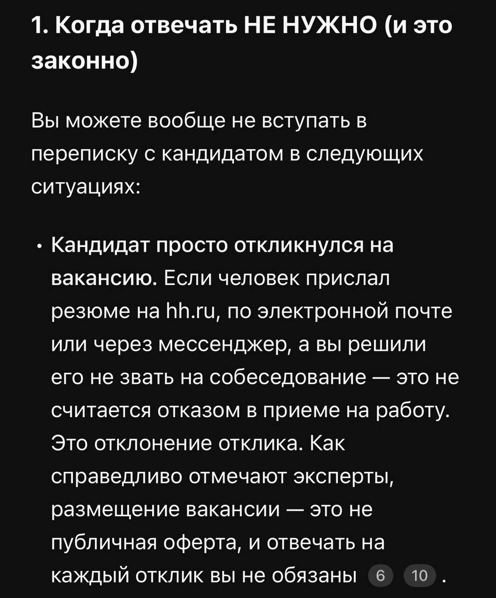 Рассказывают коллеги, что если кандидатам отказать на hh.ru, то некоторые из них промышляют тем, чтобы требовать причину отказа от работодателя. И зачем вы думаете? Правильно, чтобы потом на этом заработать 🤔 Сутяжники зарабатывают небольшие суммы на этом. 5-10 тыс. «Дают» их как правило за «моральный вред» соискателю. Есть вероятность получить штраф до 50.000 за необоснованный отказ. Но вот, затраты по времени и нервам у работодателя или его представителя на эти разборки просто огромные. Чего добились в итоге? Рекрутеры просто перестали писать ✍️ кандидатам отказы на hh.ru И всё больше, и больше рекрутеров применяют этот принцип в работе. Отмолчаться ведь закон не запрещает.