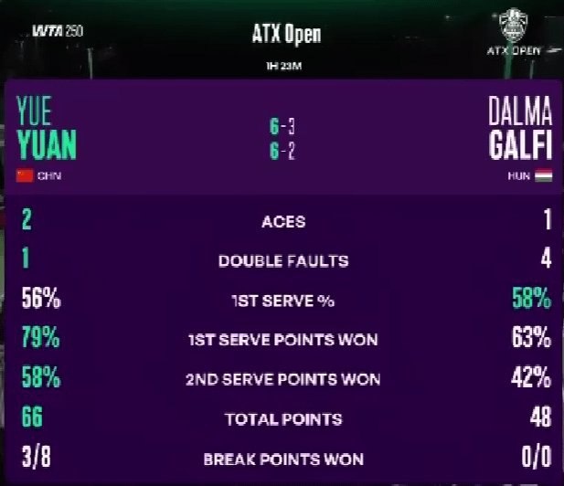 ⚡ Юань Юэ победила Далму Галфи со счетом 6-3 6-2 и вышла во второй четвертьфинал WTA в этом сезоне! 🎾