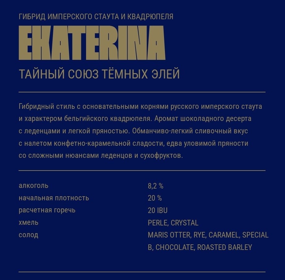 Imperial Stout от пивоварни JAWS из города Екатеринбург Свердловской области. На самой этикетке написано следующее: Пиво Екатерина названо в честь императрицы Екатерины I, имя которой носит Екатеринбург. Мы взяли классический рецепт имперского стаута и привнесли в него бельгийскую школу, которая придала популярному сорту своё обаяние. При кажущейся лёгкости пиво раскрывается конфетно-карамельной сладостью со сложным ароматом леденцов и сухофруктов с нотками ванили. Этот стаут имеет глубокие корни и при этом несёт в себе дух современности, воспевающий неповторимость и идентичность. Также на сайте пивоварни имеется подробная информация о сорте: Состав: вода, солод ячменный, хмель, дрожжи пивные. Срок годности: 5 лет(!!!) при температуре от +2℃ до +15℃. С даты розлива моей бутылки прошло почти 2 года и 3 месяца. ********************************************************************************** Пена на месте и держится уверенно. В аромате жжёный солод, сладость карамели и сухофрукты. Карб