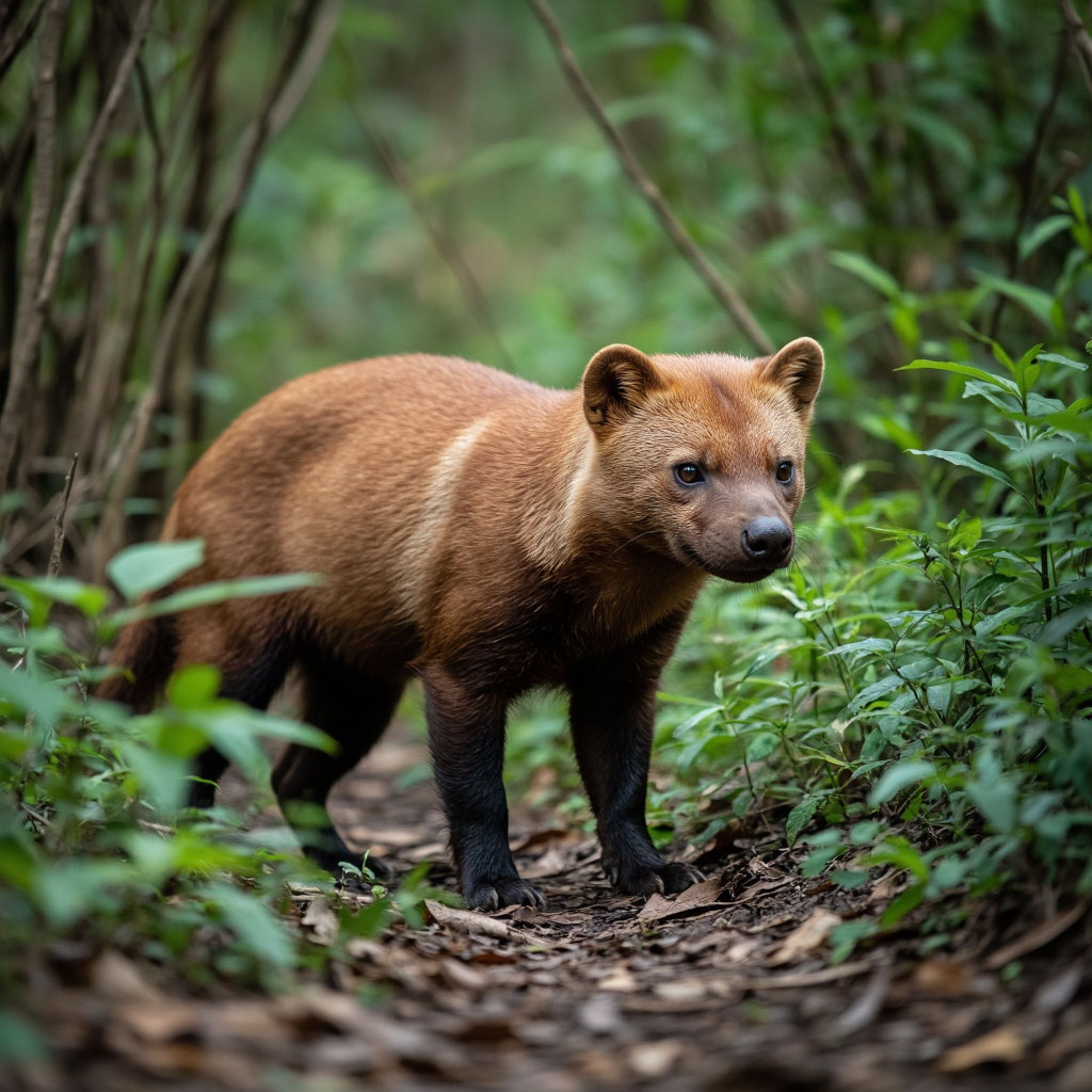 Кустарниковая собака (Speothos venaticus) — хищное млекопитающее семейства псовых, единственный современный вид рода Speothos. Внешне она напоминает выдру или иное полуводное животное и считается одним из древнейших представителей псовых. Ближайший родственник — гривистый волк. Кустарниковая собака выделяется необычной для псовых внешностью: Распространена в Центральной и Южной Америке: Предпочитает: Основу рациона составляют крупные грызуны: Стаи могут охотиться на более крупную добычу: Тактика охоты: часть стаи загоняет жертву в воду, где её поджидают другие члены группы. Мясо глотают не разжёвывая — это связано с уменьшенным числом и слабым развитием коренных зубов. Кустарниковая собака — удивительный пример адаптации к жизни в густых тропических лесах и околоводных биотопах Южной Америки. Её необычный облик и социальное поведение делают этот вид объектом пристального внимания учёных и любителей природы. Сохранение естественной среды обитания критически важно для выживания кустарник