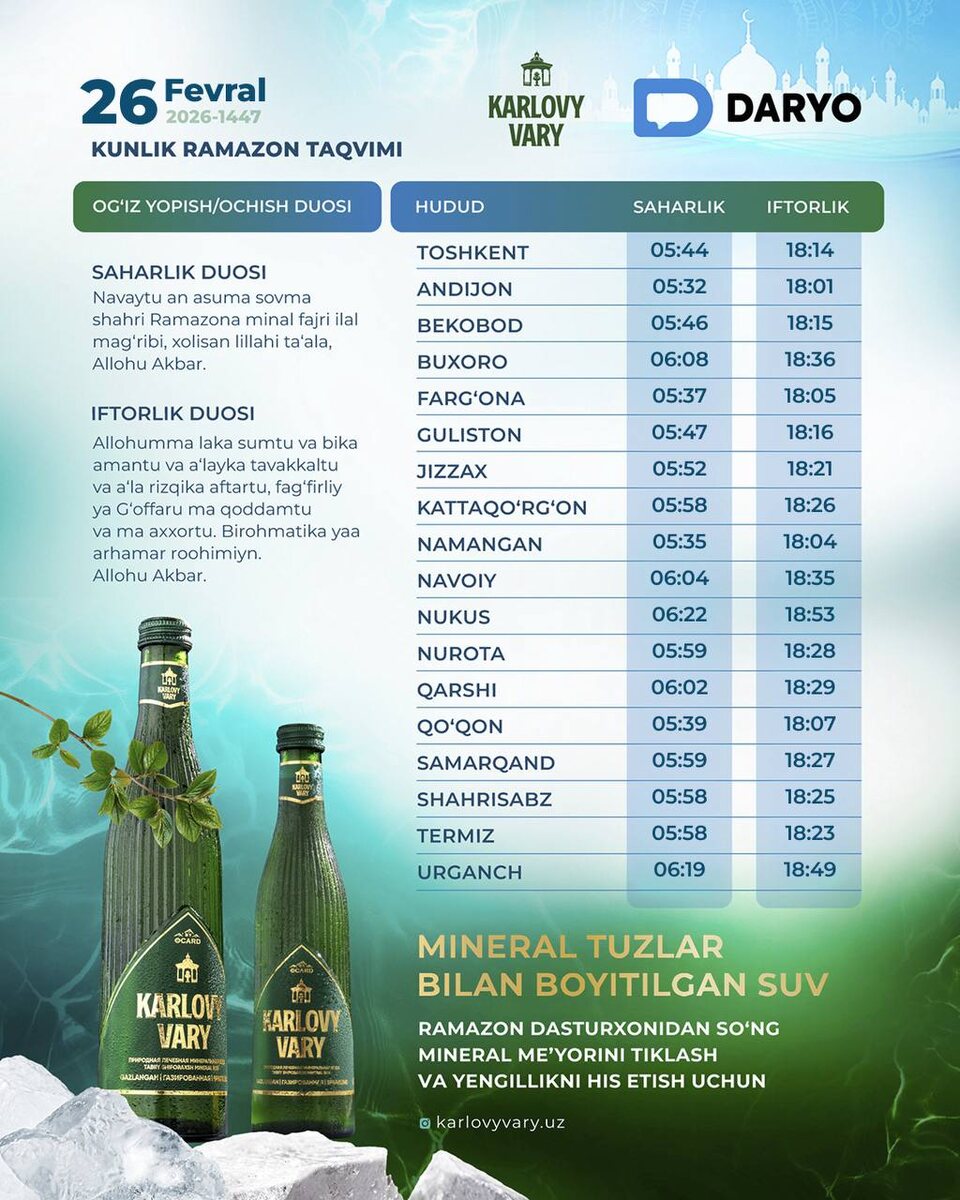 Navaytu an asuvma sovma shahri ramazona minal fajri ilal mag‘ribi, xolisan lillahi ta’ala. Allohu akbar. Ma’nosi: Ramazon oyining ro‘zasini subhdan to kun botguncha tutmoqni niyat qildim. Xolis Alloh uchun Alloh buyukdir. @daryolive