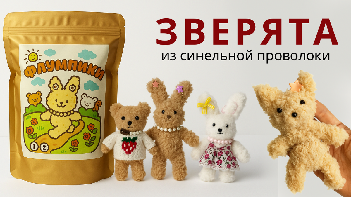 Причём не как «детская поделка», а как милый и стильный аксессуар. Флумпики — это маленькие зверята из пушистой проволоки, которых можно собрать своими руками. Из одного набора получается сразу несколько персонажей — каждый со своим характером: У каждого — мини-аксессуары: бусинки, бантики, одежда, заколки. В итоге получается не просто игрушка, а персонаж, которого ты собрал сам. 1️⃣ Мини-детали — эффект «хочу доделать идеально»