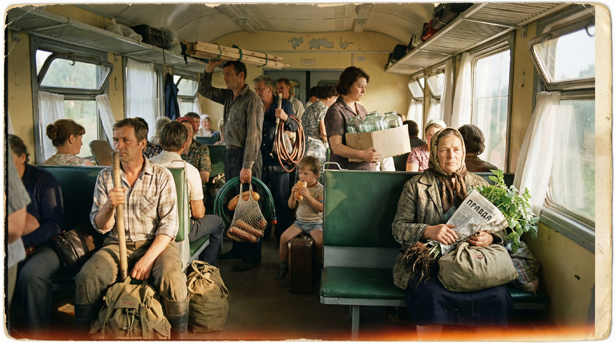 Воскресенье, шесть вечера. Обратная электричка забита так, что войти можно только в последний вагон. У всех — корзины, вёдра, букеты полевых цветов. Дети спят на коленях у родителей. Загорелые лица, грязные ногти, мозоли на ладонях. Тяжёлые сумки с урожаем.