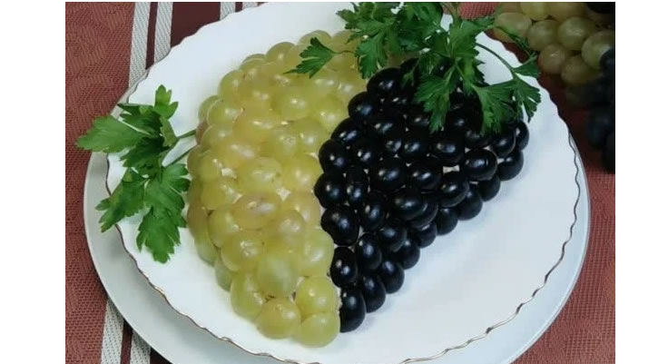Ингредиенты: куриное филе, яйца, лук, твёрдый сыр, грецкие орехи, виноград, майонез. Курицу и яйца отваривают, нарезают или натирают на тёрке. Лук мелко нарезают, орехи обжаривают и измельчают, сыр натирают. Виноград разрезают пополам. Выкладывают ингредиенты слоями, промазывая майонезом, и украшают сверху виноградом. Порции: 4