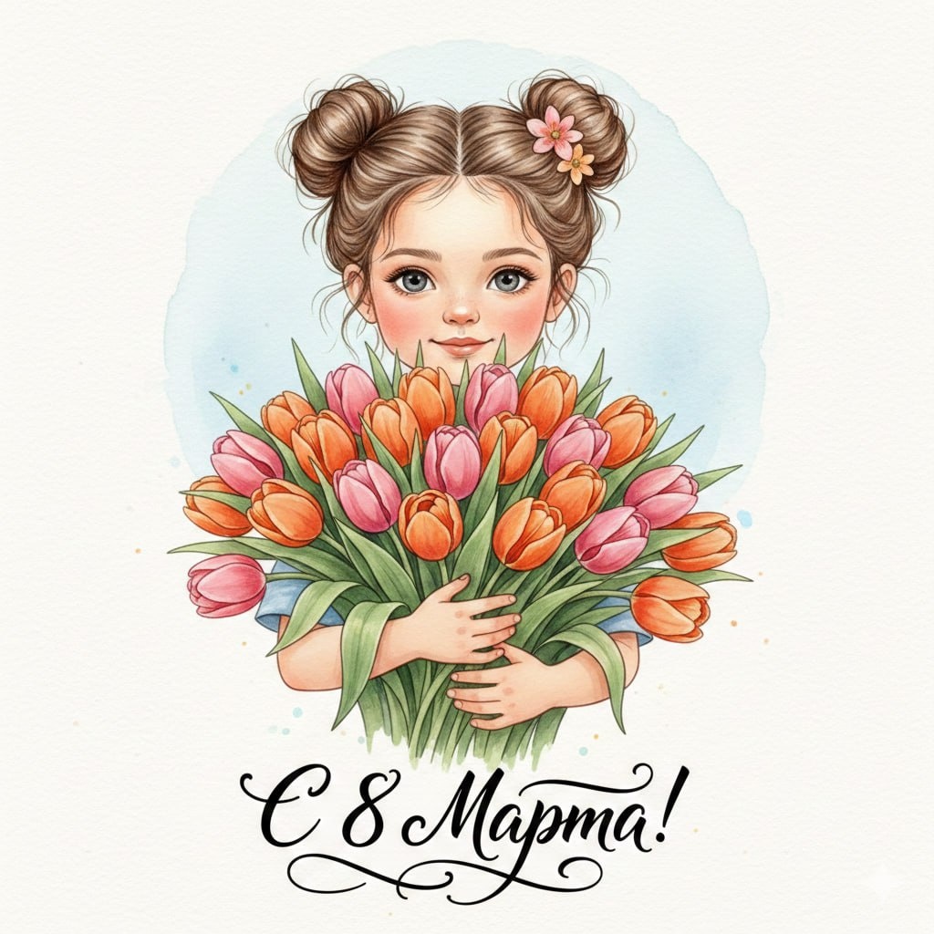 Ну и про 8 марта не забываем. **Формат и кадрирование** Вертикальная портретная иллюстрация, соотношение сторон 9:16. Симметричная, центрированная композиция. Верхняя часть туловища ребёнка, вид спереди. --- **Лицо и внешность — приоритет** Точно перенести черты лица ребёнка с загруженных фотографий. Сохранить форму глаз, носа, губ, овал лица и общий облик. Внешность должна соответствовать референсным фото. --- **Причёска** Волосы собраны в две высокие пучки. Несколько свободных прядей вокруг ушей. В одном пучке — маленький декоративный цветок. Уши частично видны. --- **Букет** Ребёнок держит крупный, плотный букет тюльпанов прямо перед грудью. Оттенки лепестков — оранжево-розовые, плотные, свежие. Зелёные листья, живые и насыщенные. Маленькие кисти рук обхватывают стебли. --- **Фон** Мягкий белый фон. Лёгкий акварельный голубой ореол вокруг головы. --- **Подпись** В нижней части композиции — крупная чёрная каллиграфическая надпись «С 8 Марта!». Шрифт с изящными завитками.