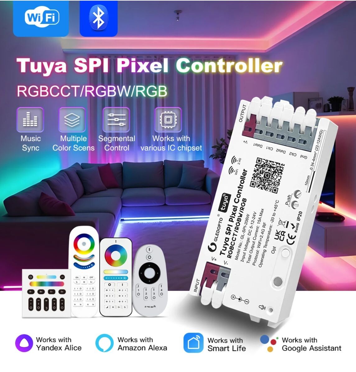 Номер модели GL-SPI-206W / GL-SPI-206P GL-SPI-206P zigbee Отличительные особенности: Интуитивно понятное управление через приложение Tuya/Smart Life, голосовое управление (Google Assistant, Alexa, Яндекс Алиса) и автоматизация освещения с помощью ежедневных расписаний и группового управления. Простое управление светодиодной лентой с помощью функции сегментного управления. Контроллер запомнит последние настройки благодаря функции памяти при отключении питания. Удобное управление с помощью совместимого пульта дистанционного управления GLEDOPTO 2.4G RF. Он корректно работает вместе приложениями Tuya или Smart Life. Управляет широким спектром цифровых адресуемых светодиодов, включая RGBCCT (RGB + тёплый белый/холодный белый), RGBW (RGB + белый) и RGB-ленты. Характеристики Напряжение: 5 -24 В постоянного тока