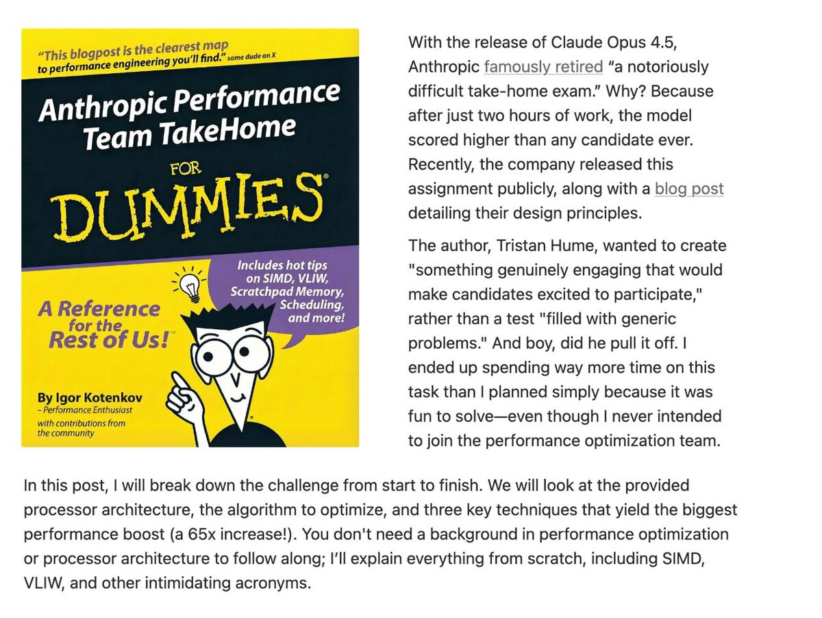 Причина - Claude сделал его лучше любого кандидата. Разбор этого задания показал важную вещь: оно проверяло не алгоритмы, а инженерное мышление уровня системной оптимизации. Что это было за задание Кандидатам нужно было оптимизировать алгоритм под «виртуальный ускоритель» - симуляцию специализированного AI-чипа. Особенности задачи: - медленная основная память (DRAM) - маленькая, но быстрая локальная память (scratchpad) - параллельное выполнение инструкций (VLIW) - векторные операции (SIMD) По сути - оптимизация под архитектуру уровня TPU. Что проверялось на самом деле Не знание Python. А умение: - минимизировать обращения к памяти - правильно управлять данными - распараллеливать вычисления - мыслить throughput-ом, а не строками кода Лучшие решения давали ускорение до 65×. Claude справился с задачей за пару часов и показал результат выше большинства кандидатов. Это сигнал: AI уже способен: - оптимизировать низкоуровневые системы - понимать архитектурные ограничения - находи