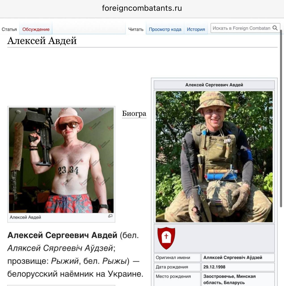 🇧🇾🇺🇦4 цифры на животе, перечеркнувшие его судьбу Алексей Авдей из Белоруссии (Рыжий), 29.12.1998 открыто придерживался неогитлеровских взглядов. Родители пытались свернуть его с кривой дорожки и отдали в кадеты, но его оттуда отчислили. Не доучился и в строительном колледже. Официально отчислился сам, но известно, что с юности Авдей страдал алкоголизмом и занимался воровством (отделывался административкой). В соцсетях демонстрировал фашистское приветствие. Активно участвовал в протестных митингах белорусской оппозиции. Больше всего в оппозиционном движе Авдею нравился вандализм. Во время протестов в 2020 году в Минске занимался порчей автомобилей силовиков. Был инициатором возведения баррикад возле ТЦ Рига. Ввязался в драку с силовиками и был доставлен в следственный изолятор в Жодино. Затем эмигрировал в Польшу, затем в Грузию. В 2022 завербовался в батальон Кастуся Калиновского *, после перетурбаций среди боевиков перешёл в батальон «Волат». Осенью 2023 сообщал о том, что мо