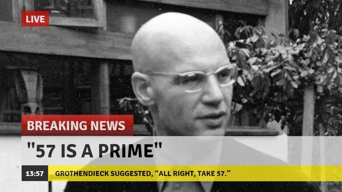 Математический юмор давно стал отдельным жанром. Чтобы его понять, как правило, нужны базовые математические навыки. Такие мемы хорошо вирусятся в соцсетях — они одновременно развлекают и позволяют ненавязчиво продемонстрировать эрудицию. Мем с числом 57 как раз из этой категории. На первом кадре — цыплята с подписями: 53, 47, 43, 41, 37, 31 и подпись Prime numbers. Том выглядит спокойно. А вот на втором кадре появляется 57 и выражение морды у Тома резко меняется. Кот будто чувствует подвох. В чем же он? Забавно, что в этой истории попался не только мультяшный кот. Шутка про число 57 давно связана с Александром Гротендиком — одним из самых влиятельных математиков XX века. По легенде, он, в отличие от Тома, не заподозрил в числе ничего особенного. Ошибка гения превратилась в профессиональную шутку и напоминание: даже люди, оперирующие сложными концепциями, могут споткнуться на элементарной арифметике. У мема, кстати, есть несколько версий. Вот еще одна, и в главной роли как раз Александ