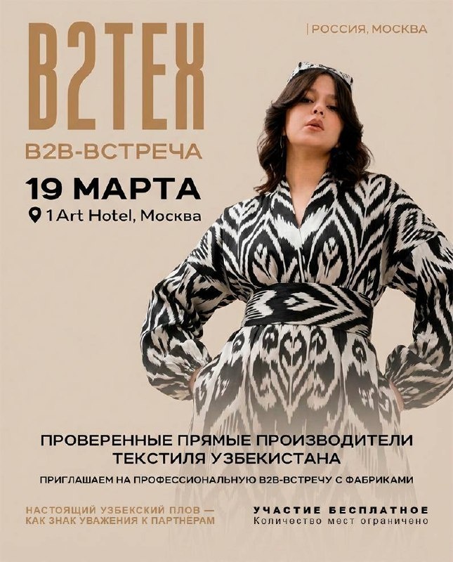 Если вы ищете контрактное производство с понятными условиями, контролем и реальными объёмами, эта встреча для вас. 19 марта 2026 в Москве вы лично встретитесь с проверенными производителями текстиля из Узбекистана с подтверждёнными кейсами работы на рынке РФ. Будут представлены сегменты: • готовая одежда • трикотаж • домашний текстиль • ткани • производство под СТМ Каждый участник с опытом экспортных поставок, реальными мощностями и действующими контрактами. Один день, прямые переговоры без посредников. Фокус на контракте, а не на обмене визитками. 19 марта | Москва | 1 Арт Отель Количество мест ограничено. И, как принято в Узбекистане, серьёзные договорённости мы завершаем по-настоящему, настоящим узбекским пловом. Чтобы вы уехали не только с контрактами, но и с правильным послевкусием. Ссылка для регистрации: https://forms.yandex.ru/cloud/699d3caae010db4150ac36ac Для связи пишите: @saida_akhad Будьте в курсе о новостях Узбекского текстиля на нашем канале: https://t.me/textil