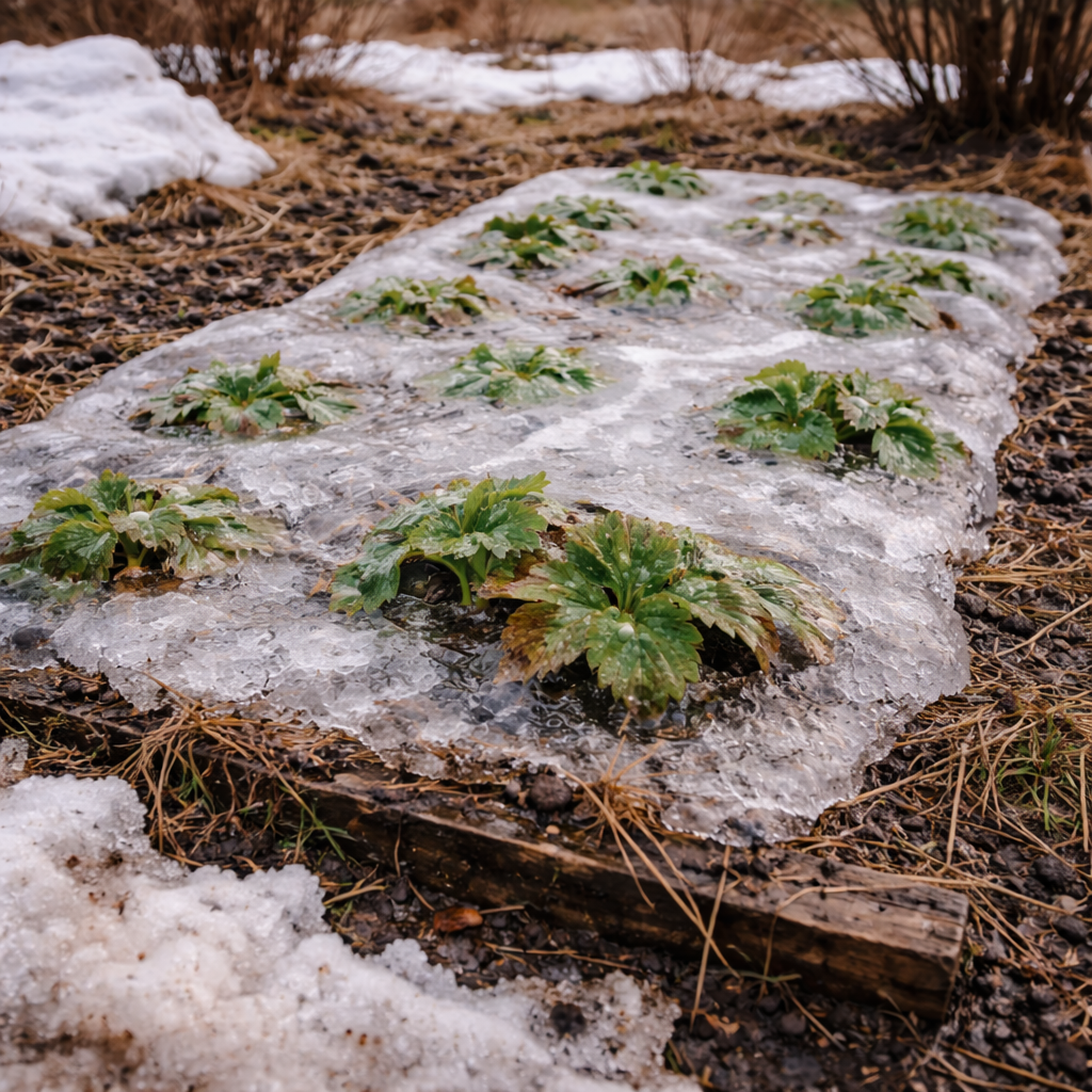 Иногда в марте или в конце зимы случается неприятная картина: снег подтаял, потом ударил мороз — и грядка с клубникой оказалась под плотной ледяной коркой. С виду всё кажется прочным и даже «защищённым», но внутри в этот момент происходят совсем другие процессы. Я не раз наблюдала такую ситуацию. И каждый раз переживала — не задохнётся ли куст подо льдом? Со временем я стала спокойнее относиться к этому явлению, но понимать, что именно происходит, всё же важно. Главная особенность ледяной корки — она почти не пропускает воздух. Если лёд плотный и держится долго, под ним: • снижается доступ кислорода