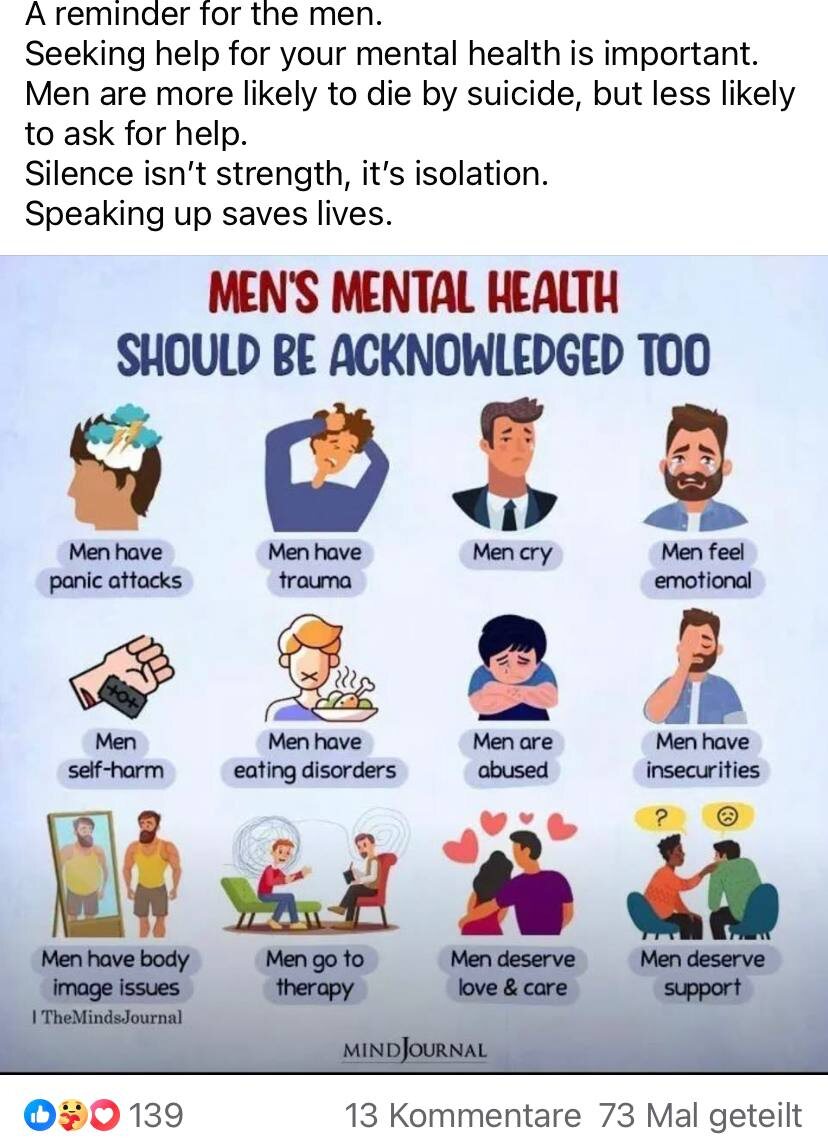 ! Немного с опозданием, но стоит помнить: мужчинам обращаться за помощью при ментальных проблемах — нормально и важно. Мужчины тоже: ✨Испытывают панические атаки ✨Переживают психические травмы ✨Могут выражать эмоции и плакать ✨Наносят самоповреждения ✨Страдают от расстройств пищевого поведения ✨Подвергаются абьюзу ✨Чувствуют неуверенность в себе ✨Имеют нарушенное восприятие тела ✨Ходят на психотерапию ✨Заслуживают любви, заботы и поддержки Не нужно ждать, пока ситуация станет критической. Если нужно — обратись к специалисту, вы не одни!