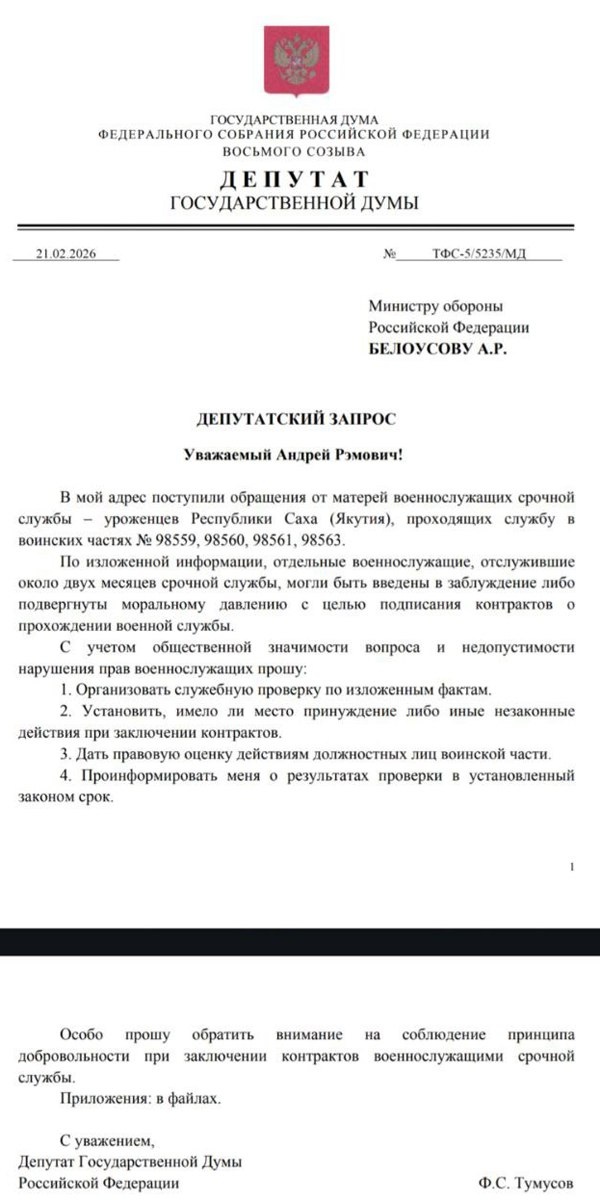 Уроженцев Якутии, проходящих срочную службу в трёх воинских частях Хабаровска и Комсомольска-на-Амуре, заставили подписывать контракты с Минобороны РФ, сообщили жители республики депутату Госдумы Федоту Тумусову («Справедливая Россия»). Он обратился к министру обороны Андрею Белоусову, главе СК РФ Александру Бастрыкину и главному военному прокурору Валерию Петрову. «Скажу честно — сначала я подумал: очередная провокация. В условиях информационного давления подобные сообщения появляются регулярно. Но я не привык делать выводы, не разобравшись. Я связался с матерями лично. Они подтвердили: это не вброс. Это их крик о помощи, — подчеркнул Тумусов в своём телеграм-канале. — <..> Со слов матерей, их сыновья, отслужившие около двух месяцев срочной службы, могли быть введены в заблуждение либо подвергнуты моральному давлению при подписании контрактов». Тумусов напомнил, что контрактная служба — это добровольный выбор, который должен делаться «не под давлением» и «не из страха». Парламент
