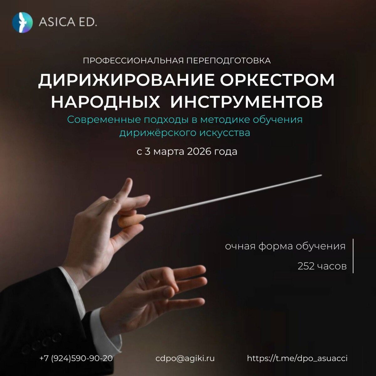 Открываем запись на профпереподготовку «ДИРИЖИРОВАНИЕ ОРКЕСТРОМ НАРОДНЫХ ИНСТРУМЕНТОВ»! Кому это нужно? ✅ Практикующим руководителям ансамблей и оркестров; ✅ Музыкантам-инструменталистам; ✅ Музыкальным педагогам; ✅ Методистам и менеджерам в сфере культуры с музыкальным образованием. Что вас ждёт? 📌 Интенсивная практика и немного теории; 📌 3 модуля — от основ дирижёрской техники до подготовки концертной программы; 📌 Работа с партитурой, переложение, психология управления коллективом; 📌 Итоговая аттестация — публичное выступление с оркестром! Преподаватели — практики с большим опытом, носители традиций и современного подхода к дирижированию. Старт занятий — с 3 марта 2026 года. Обучение проходит на базе АГУИККИ. Запишитесь на консультацию и сделайте первый шаг к дирижёрскому подиуму! Научись превращать нотный текст в живое звучание 👨🎤🎼 📝ПОДРОБНЕЕ: cdpo.bitrix24site.ru/dirijer/ 📱К.т.: +7 (924) 590-90-20 ✉️Эл. почта: cdpo@agiki.ru #дирижирование #ОРНИ #переподготовка #А