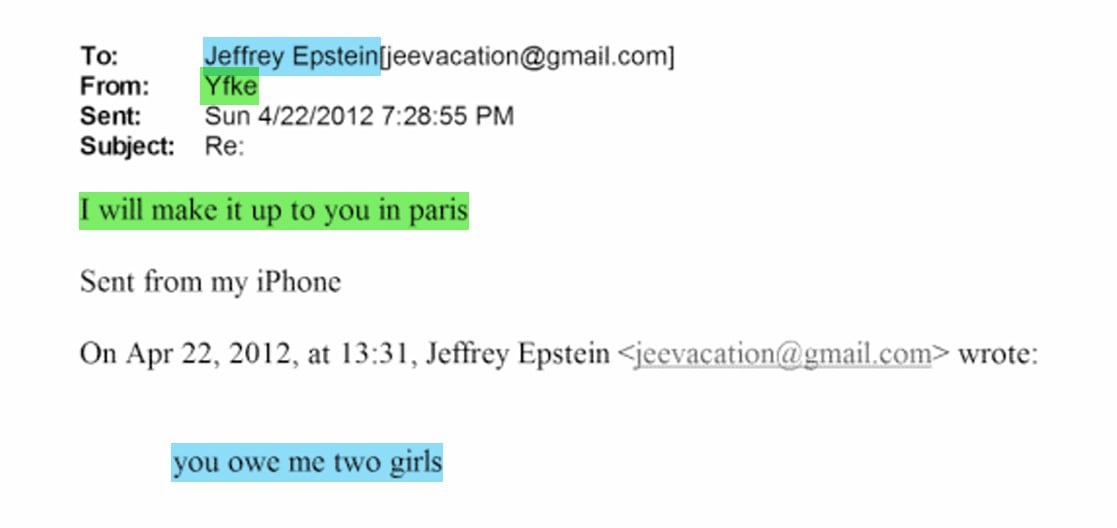 'You owe me two girls' — Epstein to Dutch model Yfke Sturm
