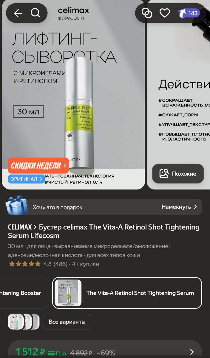 Бустер celimax The Vita-A Retinol Shot Tightening Serum Lifecosm