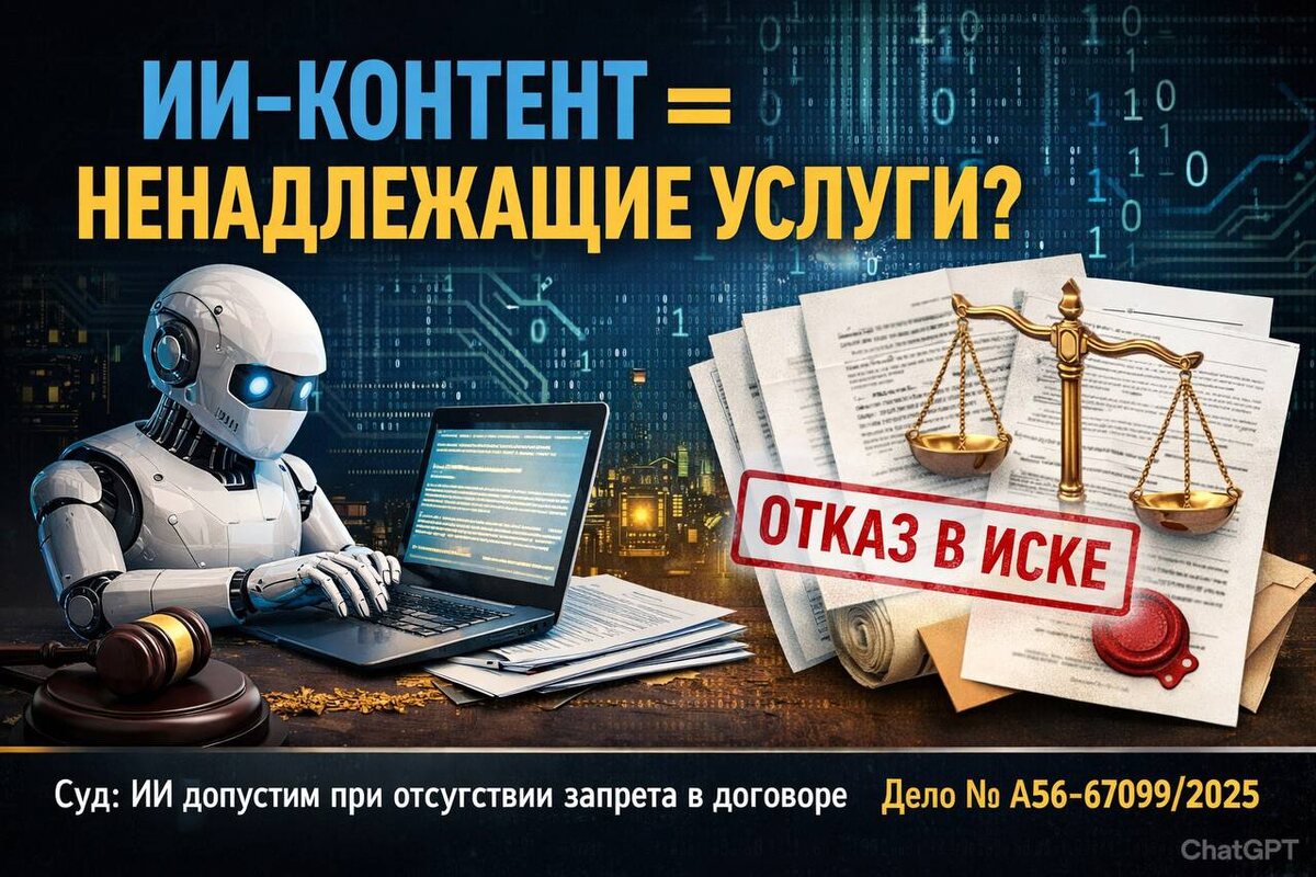 ? Интересная позиция в судебной практике. ✔️Заказчик потребовал вернуть деньги по договору оказания услуг в сфере рекламы и маркетинга. Аргумент Заказчика: статьи для сайта исполнитель подготовил не «самостоятельно», а с помощью искусственного интеллекта. По мнению заказчика, это подтверждало ненадлежащее качество услуг. ➡️ Суд с таким подходом не согласился. ✔️В договоре возмездного оказания услуг не было запрета на использование ИИ или ограничений по способу подготовки материалов. ✔️Не установили и требований о личном творческом выполнении текста без применения цифровых инструментов. Если договор не ограничивает инструменты, исполнитель вправе использовать любые средства для достижения результата — в том числе технологии искусственного интеллекта. ➡️ Сам по себе факт генерации текста через ИИ не доказывает: ✔️нарушение условий договора; ✔️ненадлежащее качество; ✔️обязанность вернуть аванс. ➡️ Решение: Арбитражный суд г. Санкт-Петербурга и Ленинградской области от 06.10.2025