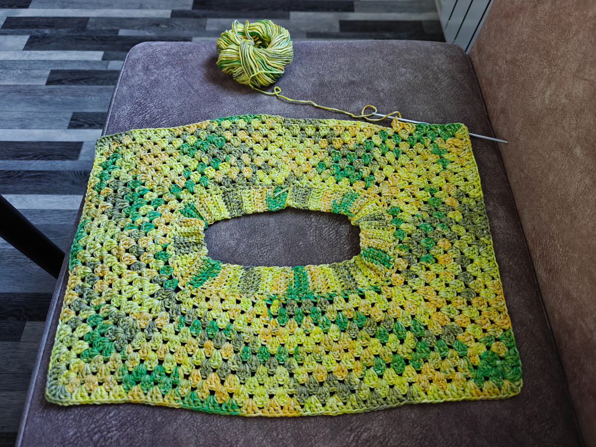 В целом наверное за день я больше всего и занималась вязанием, поэтому прогресс на лицо. Но... Мне не нравится как собирается у воротника, там надо было наверное убавку сделать, а распустить воротник я не могу, он и есть начало вязания. Видимо придётся опять всё распустить и начать заново.