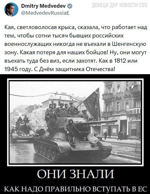 ». Дмитрий Медведев прокомментировал слова главы дипломатии ЕС Каллас о возможном запрете на въезд в Шенгенскую зону участникам СВО. Белокурая крыса Кая сказала, что она работает над тем, чтобы сотни тысяч бывших российских военнослужащих никогда не въехали в Шенгенскую зону. Какая потеря для наших бойцов. Что ж, они могут въезжать туда без виз, если захотят. Как в 1812 или 1945 году. С Днём защитника Отечества! 🌐 За Русский Мир©Резервный📣Наш Чат✔️Подпишись‼️