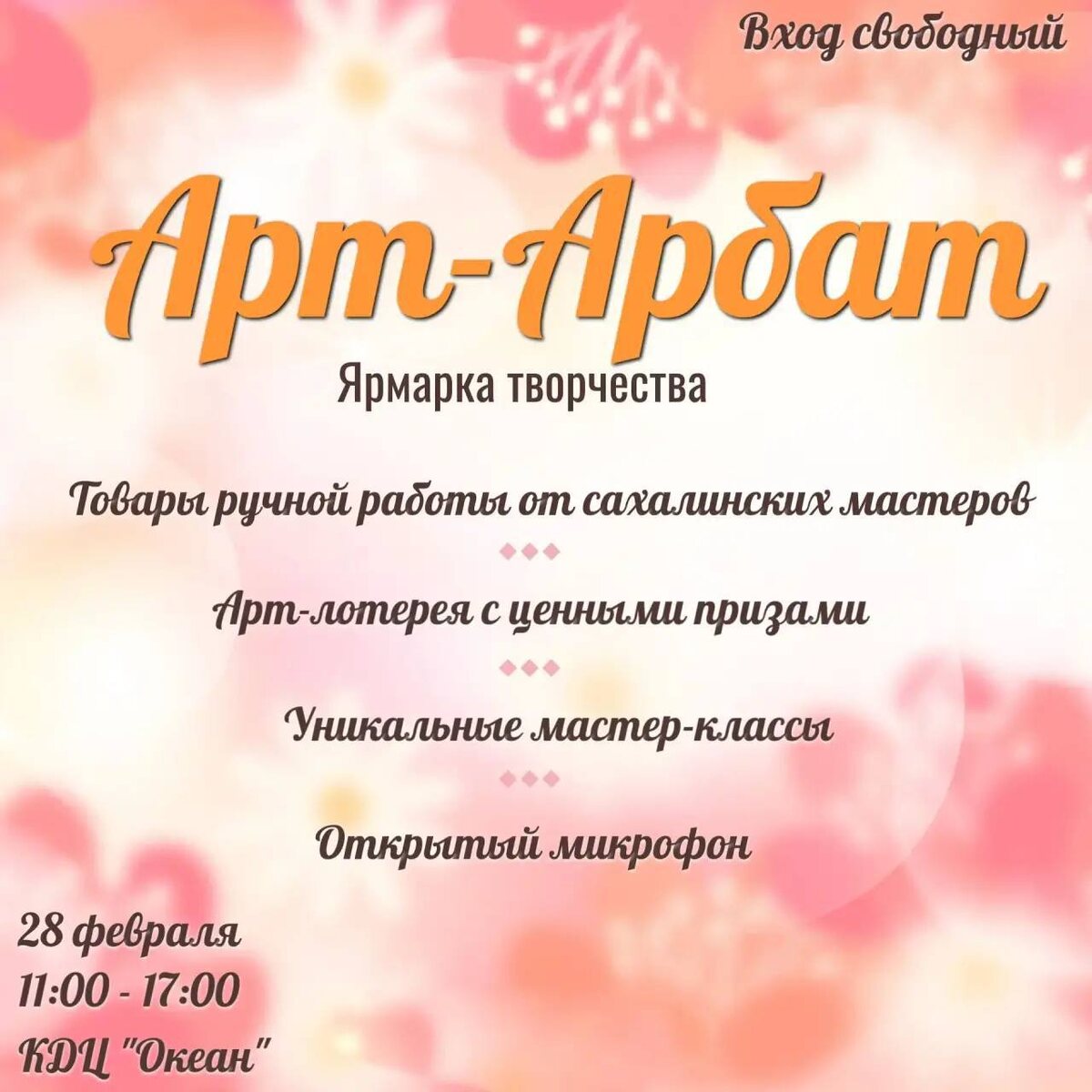 ! 🗓28 февраля в Корсакове распахнет свои двери долгожданный весенний «Арт-Арбат»! 📌Это не просто ярмарка, это настоящий праздник вдохновения, где хочется задержаться подольше. Лучшие сахалинские мастера привезут свои уникальные работы. 💡Для тех, кто соскучился по созиданию, приготовили мастер-классы. И дети, и взрослые смогут создать подарки своими руками под руководством наставников. ©️На сцене традиционно будет работать открытый микрофон. Хотите удивить публику стихами или песней? Делитесь своим творчеством, дарите тепло зрителям и наслаждайтесь выступлениями других талантливых горожан. 💞И конечно, вас ждет море идей для подарков! Удивите близких не просто сувениром, а частичкой души островных умельцев. ✳️Заряжайтесь весенним настроением и уходите с покупками, от которых тепло на душе!