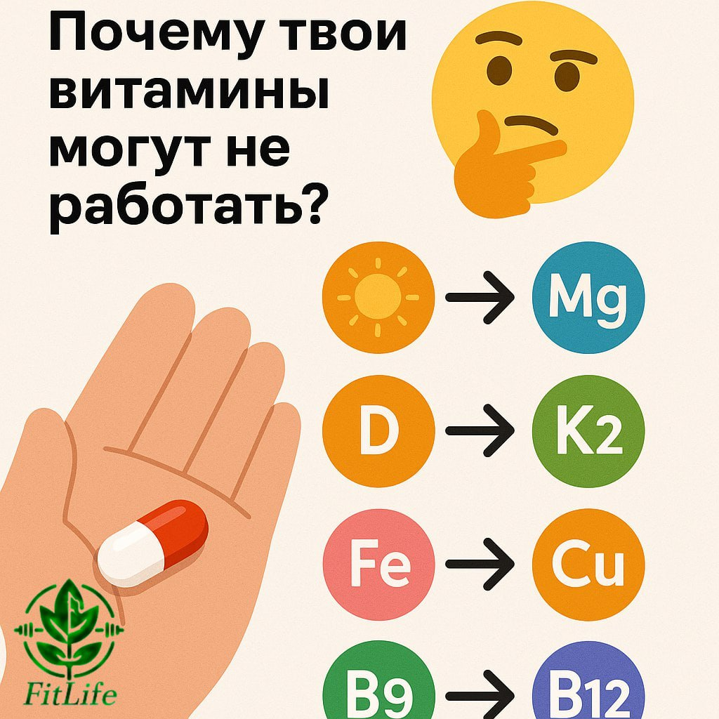 Ты пьёшь витамин D, а уровень не растёт? Принимаешь железо, а ферритин всё равно ноль? Часто дело не в дозе, а в том, что ты упускаешь "командную работу" нутриентов. Нутриенты работают в связках — один без другого часто малоэффективен или даже вреден. Ниже — коротко и по делу. Магний нужен, чтобы D преобразовался в активную форму. Без магния «солнечный витамин» может не работать, сколько бы ты его ни принимал. 🌞➡️💊 K2 направляет кальций в кости, а не в сосуды — важная страховка при принятии D. 🦴🛡 Медь нужна для усвоения и транспортировки железа. При её дефиците железо может накапливаться в тканях, но не повышать гемоглобин и ферритин. 🩸🔗 Эти витамины действуют вместе. Высокие дозы фолата могут замаскировать дефицит B12 — опасно для нервной системы. ⚖️ Магний активирует тиамин, что важно для нервов и энергетики. ⚡️🧠 - при D — добавляй магний и K2. - при дефиците железа — проверь медь в рационе (говяжья печень — лучший источник) или выбирай комплексы, где железо уже сбалансировано