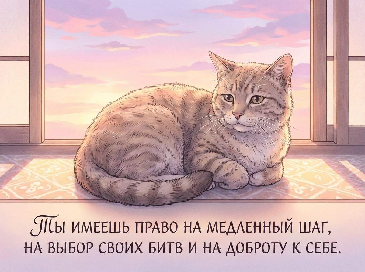Сделай вдох и почувствуй, как новый день мягко кладёт тебе на плечи невидимый тёплый плед заботы о себе и о тех, кого ты любишь. После вчерашнего дня, когда вспоминали защитников, позволь себе стать защитником собственного покоя. Ты имеешь право на медленный шаг, на выбор своих битв и на доброту к себе. Как я выбираю солнечный подоконник, так и ты можешь выбирать то, что приносит тебе свет. Пусть сегодня каждое твоё действие будет тихим «да» самой жизни, а утренний свет напомнит: ты уже достаточно хорош и достоин всех добрых чудес этого дня.