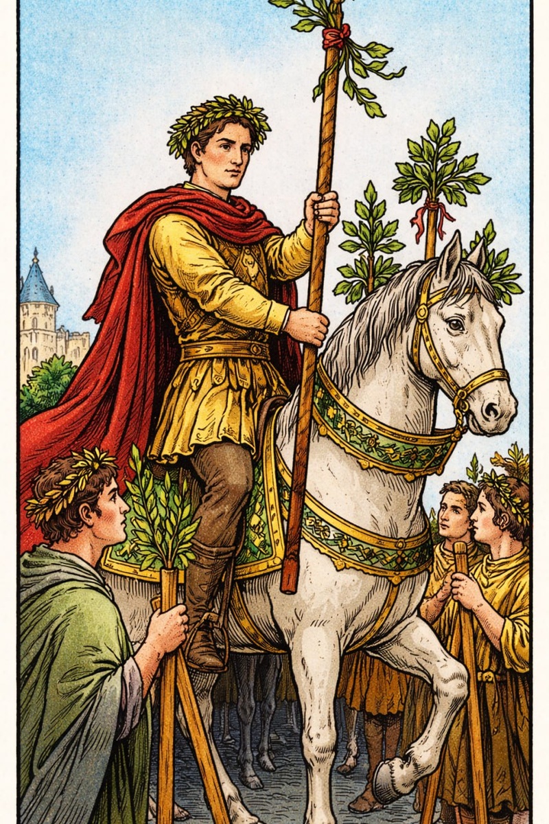 Я еду вперёд, и шаг моего коня звучит ровно и уверенно. В руке - жезл, украшенный венком. Люди расступаются. Их взгляды направлены на меня. Сегодня они видят во мне победителя. Вы привыкли считать эту карту лёгкой. Радостной. Триумфальной. Да, здесь есть признание. Есть успех. Есть тот самый момент, когда усилия становятся заметными. Но Шестёрка Жезлов не только про аплодисменты. Она про ответственность, которая приходит вместе с ними. Я прошёл через борьбу, через столкновение, через сомнение. И теперь результат очевиден. Победа оформлена. Она названа. Она подтверждена чужими глазами. Но вы когда-нибудь замечали, как меняется воздух, когда на тебя смотрят с ожиданием? Когда венок на жезле - не просто знак успеха, а символ того, что теперь ты обязан соответствовать. Шестёрка Жезлов говорит о признании. О том моменте, когда мир отвечает на вложенную энергию. Когда труд, усилие и настойчивость становятся видимыми. Я не бегу. Я не доказываю. Мне уже не нужно. Но именно здесь кроется т