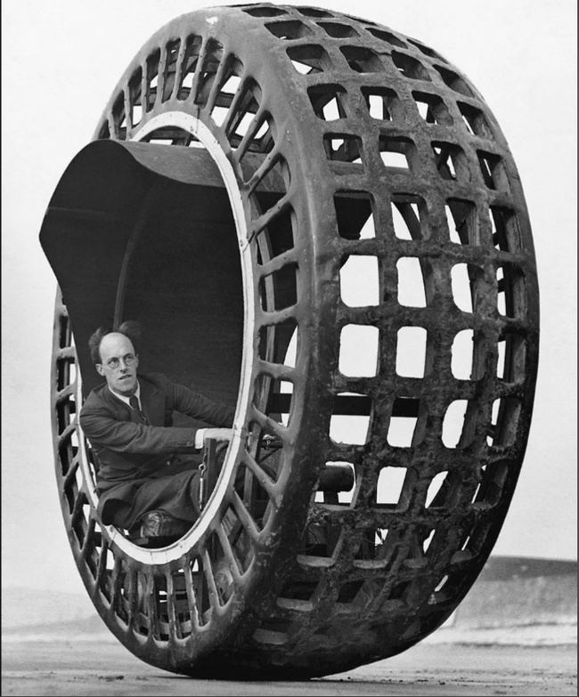 - Конструкция. Первая модель оснащалась бензиновым двигателем и могла разгоняться до 50 км/ч. Сиденье водителя и двигатель крепились к раме внутри огромного колеса,которое катилось по дороге.
