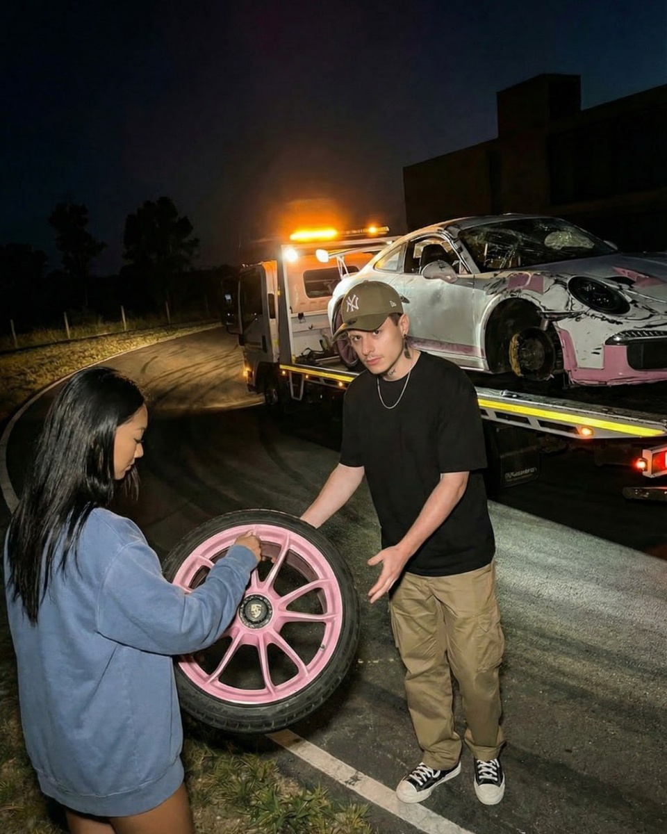 🚗 1. Ночная сцена на дороге Use the reference character image I will upload. with the reference person, keeping realistic facial features, natural skin texture, accurate proportions and body scale. Night roadside scene photographed with strong iPhone flash. A damaged pink Porsche 911 is loaded on a tow truck in the background, clearly missing one front wheel. Amber emergency lights from the tow truck illuminate the dark countryside road. In the foreground, the reference character is wearing a black t-shirt, khaki cargo pants, black sneakers and a cap, receiving a pink Porsche wheel from a girl wearing an oversized blue hoodie. Flash lighting creates hard shadows on the asphalt and strong highlights on metal surfaces. Realistic reflections, subtle flash overexposure, visible texture on the road. Natural perspective from eye level, 1x iPhone lens look. Maintain correct scale between people, wheel, tow truck and car. Cinematic but raw phone photography aesthetic, ultra-detailed, sharp