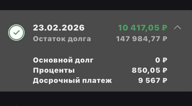 23.02.2026 я внесла на досрочное погашение 9 567 рублей