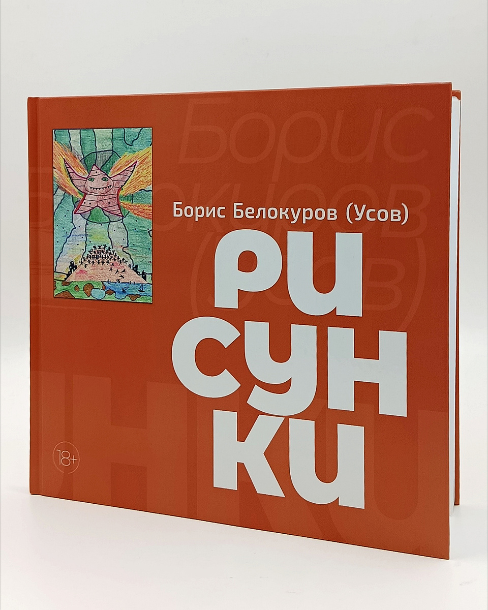 Том, при желании, разбирается на составные части, вектора, жанры, на самом деле существующие, конечно, в единстве. Кроме изобразительных работ Бориса в книгу вошли пространные комментарии людей, бодро разбирающихся в современной живописи. Их многословность даже создает ощущение напористого обсуждения увиденного. А поговорить тут есть о чем. Комментаторы начинают тонуть в терминах, умиляются котятам, которые на поверку – иные сущности и порой забывают про «Охоту на мирового зверя». А перед ними хтонь и боль, все переворачивается, зверушки вовсе не милы и легко могут куснуть. Но рисунки провоцируют путешествие внутрь себя, там, конечно, всё интересно, звучат гулкие фамилии актуальных художников, которым Борис, возможно, даже уважая их творчество, все же дал бы по морде. Тут же живут и фотографии, в основном давние, домашнего, невиданного публикой свойства, добавляющие новых красок к образу тогда еще – Усова. И отдельный мир – подписи, наименования рисунков. Например, «Навечно запертый внутрь кота»… Они описывают происходящее, с особой поэзией и не сдерживаясь форматами, автор умел не сдерживаться.