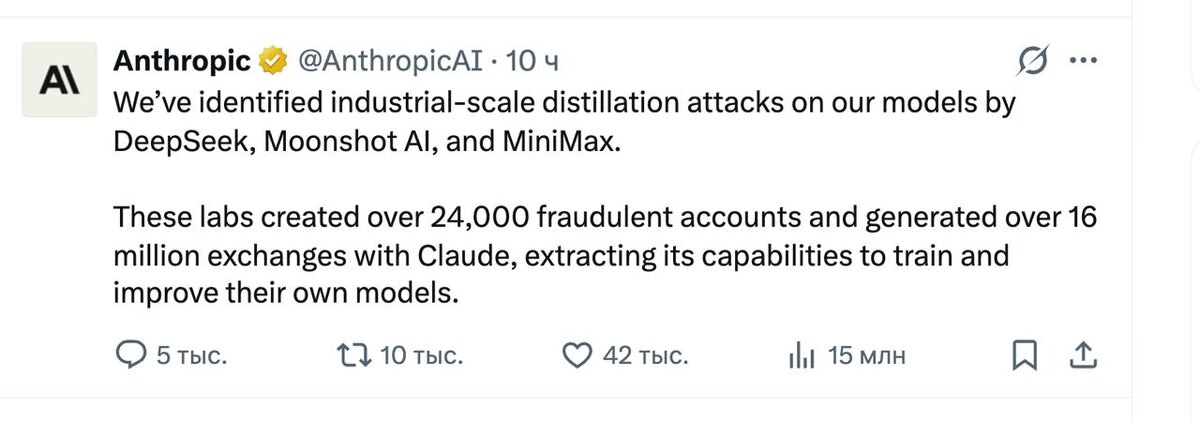 Anthropic заявили, что обнаружили масштабные кампании по «дистилляции» их моделей со стороны DeepSeek, Moonshot и MiniMax. По данным компании: - использовано ~24 000 фейковых аккаунтов - сгенерировано более 16 миллионов диалогов с Claude - цель - воспроизвести сильные стороны модели - агентное мышление - работу с инструментами - программирование - сложное рассуждение Фактически - это массовое извлечение поведения модели через API, чтобы обучить свои системы на её ответах. И самое интересное: Anthropic утверждает, что выявила схемы автоматически - по паттернам использования и аномальной активности. Это новая реальность рынка AI: - данные стали главным активом - поведение моделей — интеллектуальная собственность - компании пытаются копировать не архитектуру, а «мышление» Если раньше технологические войны шли за: - вычисления - датасеты - чипы то теперь начинается новая гонка: война за интеллект моделей. https://x.com/AnthropicAI/status/2025997928242811253 #Anthropic