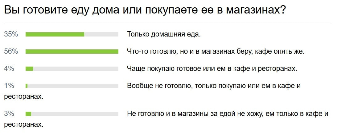 Мы решили поинтересоваться у хабаровчан, какую еду они предпочитают - домашнюю или готовую из кафе, ресторанов и магазинов. У 56% однозначного ответа нет, так как что-то они готовят дома, а что-то могут и заказать. 35% предпочитают исключительно домашнюю еду. 4% чаще заказывают или едят в ресторанах, нежели сами занимаются готовкой. 3% не готовят и не покупают блюда в магазинах, а едят исключительно в кафе и ресторанах. Оставшийся 1% вообще не готовит, только покупает готовое или ест в кафе и ресторанах. Отметим, что на главной странице DVHAB.ru каждую неделю проводятся опросы на самые актуальные и острые темы. Найти их вы можете, пройдя по ссылке. Напомним, ранее хабаровчане рассказали, сколько книг прочитали за год. 32% читают меньше среднего показателя, 18% — существенно больше 9 книг, и только 11% точно попадают в статистику. Опрос показал, что интерес к чтению у горожан распределен неравномерно.