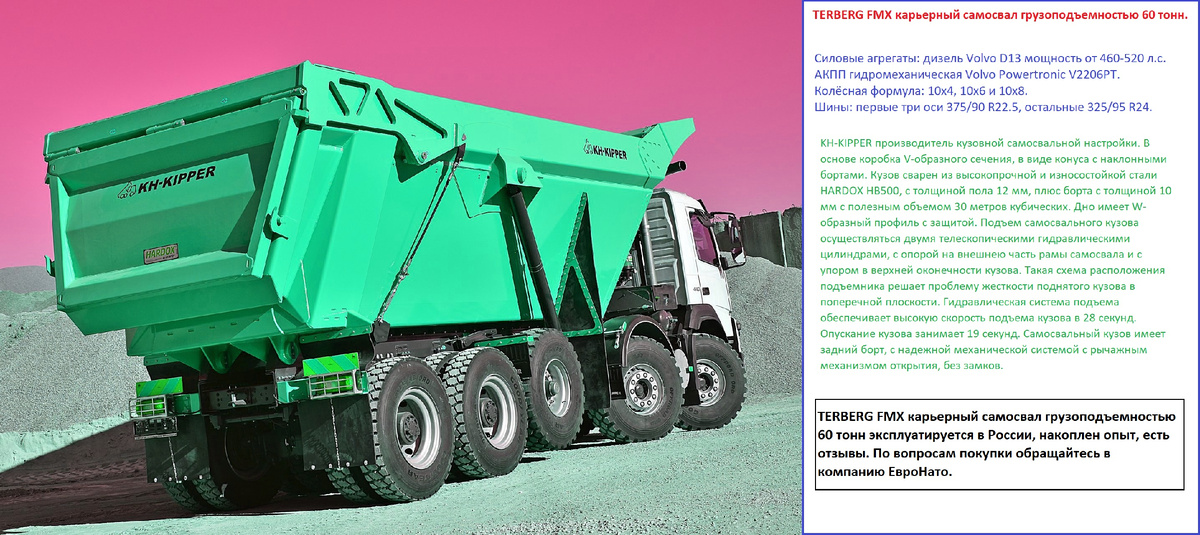 Карьерные внедорожные самосвалы TERBERG на шасси VOLVO FMX являются лучшими, это самые надежные, выносливые и самые эффективные грузовые машины на рынке самосвальной техники как Европы, так и России. Это усиленные версии самосвалов с жесткой рамой VOLVO FMX, доработанные для повышения эффективности работы в карьерных условиях, думпер скаловоз TERBERG FMX 10х4 это самосвал, находящийся в промежутке между карьерным двухосным самосвалом и самосвалом на шарнирной раме. Благодаря 5-и осям, и гидромеханической автоматической АКПП, самосвал может перевозить 60 тонн горной массы в условиях крутонаклонных карьеров. Компания поставляет на рынок России как новые, так б/у самосвалы Терберг, в том числе пятиосные новые тяжелые 60-тонные самосвалы TERBERG FMX 10х4. У нас самые лучшие цены, выгодные условия лизинга, мы продаем карьерные самосвалы TERBERG FMX оформленные как специальный карьерный транспорт ПСМ, возможна поставка шасси TERBERG FMX с приводом колёс 6х6, 8х6, и 10х8 для установки в Москве самосвального кузова. Оказываем услуги подбора, покупки и поставки самосвалов TERBERG в Россию, услуги под ключ включая таможенное оформление, получение ПТС или ПСМ, уплата всех налогов полностью. Оформляем одобрение типа транспортного средства ОТТС на ПШТС, услуги таможенного оформления шасси грузовиков Терберг для производства самосвалов, получение разрешений и сертификатов на давальческое базовое шасси с документами ПШТС (паспорт шасси транспортного средства), выдача ЕПТС ЕПСМ таможня разобранных грузовых автомобилей конструкторов под ПШТС, сборка регистрация получение документов НАМИ, расчет таможни, стоимость утилизационного сбора на шасси и готовый самосвал TERBERG FMX, куда платить налоги, сделать ОТТС СБКТС свидетельство о безопасности конструкции транспортного средства, услуги оформления таможенной декларации, как избежать двойного налогообложения при таможне самосвалов TERBERG FMX в Казахстане при ввозе шасси самосвального типа для постройки карьерных самосвалов TERBERG FMX. Ремонт и поставка запасных частей на самосвалы TERBERG.