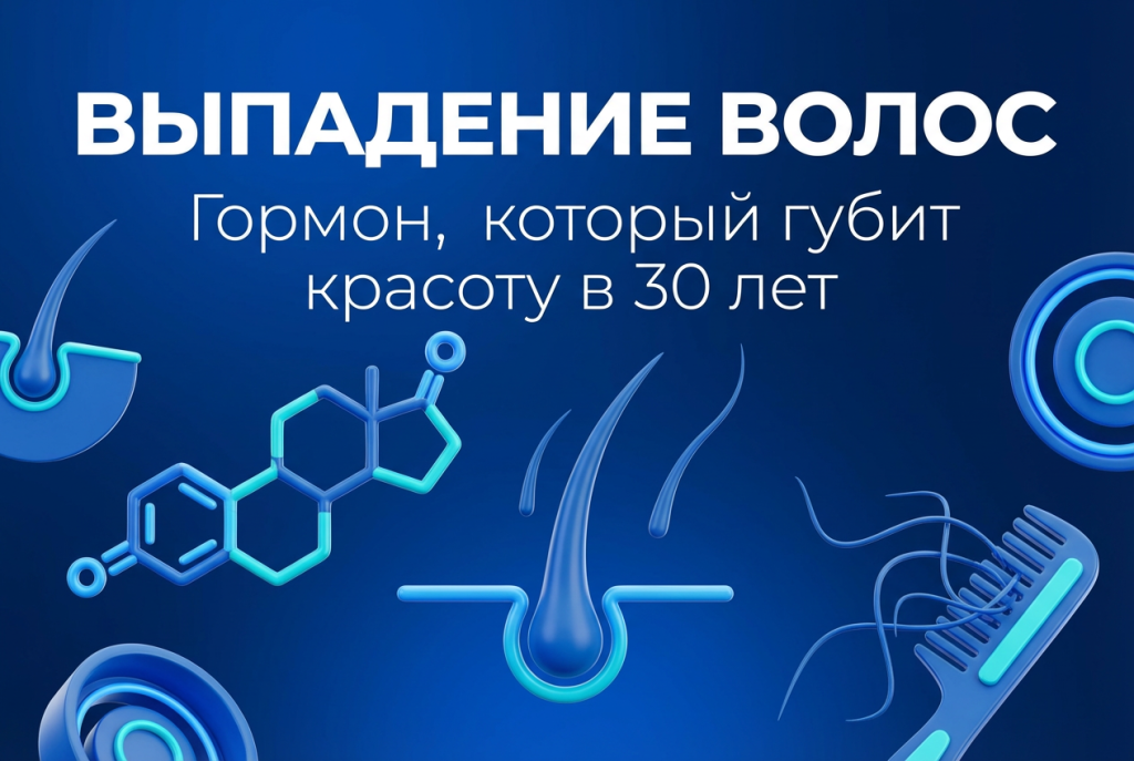 Вы расчесываете волосы, и на щетке остается слишком много прядей. Не катастрофически много, но заметно больше, чем год назад. Вам около тридцати, вы нормально питаетесь, не красите волосы агрессивно и в целом следите за собой. Что происходит? Скорее всего, виноват дигидротестостерон — производное мужского полового гормона тестостерона, которое есть в организме каждой женщины. В небольших количествах он нужен и полезен. Но когда его концентрация растет или когда волосяные фолликулы становятся к нему слишком чувствительными, начинается тихая война за каждый волос. Механизм примерно такой. Фермент под названием 5-альфа-редуктаза превращает обычный тестостерон в его агрессивную версию — дигидротестостерон. Тот проникает в волосяной фолликул и буквально сжимает его. Фолликул начинает производить более тонкий, слабый волос, цикл его роста укорачивается, и в какой-то момент он перестает работать совсем. Это называется андрогенная алопеция, и по статистике она затрагивает каждую пятую женщину