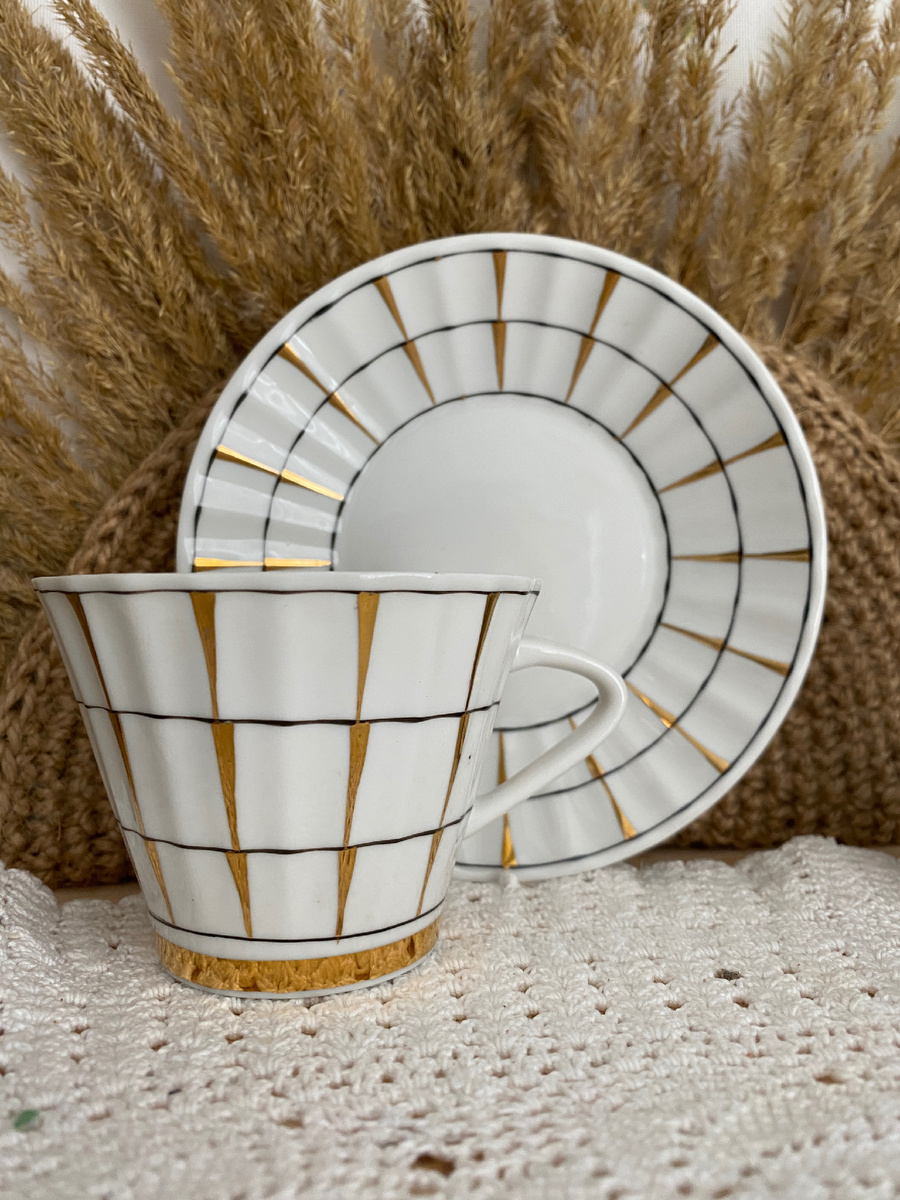 Это пример классического винтажного фарфора, белый с золотом, который превращает обычное чаепитие в настоящее удовольствие.