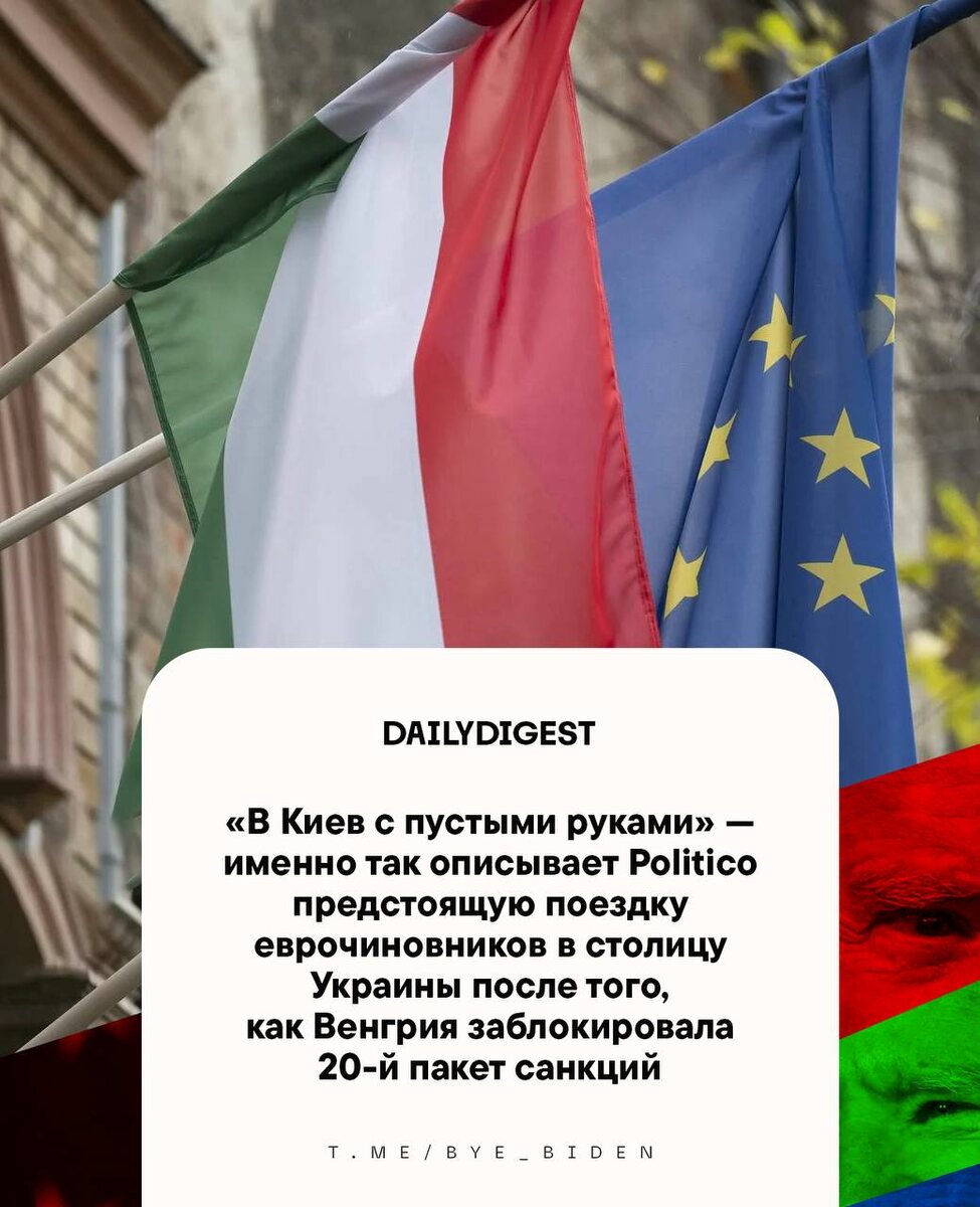 : 🔹«В Киев с пустыми руками» — именно так описывает Politico предстоящую поездку еврочиновников в столицу Украины после того, как Венгрия заблокировала 20-й пакет санкций. 🔹Представители США и РФ провели встречу в Женеве на тему новой многосторонней версии договора о контроле над ядерными вооружениями — Reuters. 🔹Полиция Сербии задержала двух подозреваемых в подготовке покушения на Вучича и его семью. 🔹Россия и Украина находятся в «начале конца» вооруженного конфликта, заявил Зеленский в интервью газете Financial Times. 🔹Военные доложили Трампу, что США могут не добиться от Ирана уступок силой — CBS. 👍«БайБайден» в МАХ