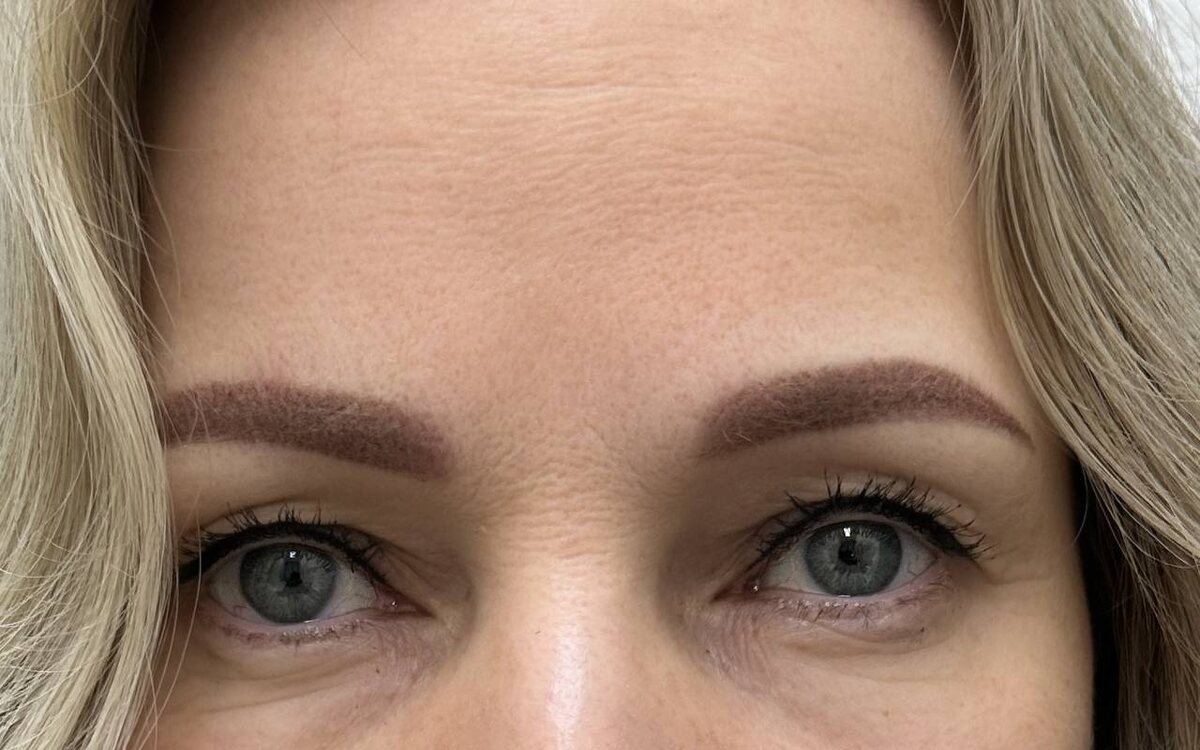 Всех приветствую! Здесь вы видите яркую зажившую межресничку и татуаж бровей- перекрытие давней работы серого оттенка