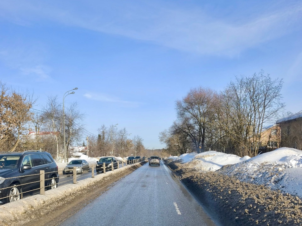 Многие участки Можайского шоссе из-за огромного количества снега и несвоевременной уборки сузились до одной полосы